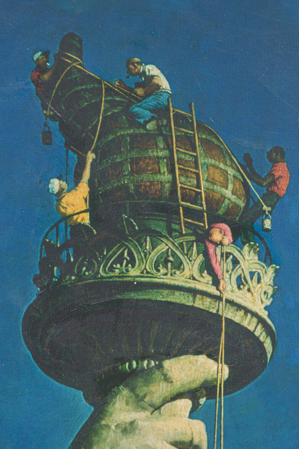 Copy of a 20th century oil painting depicting workers repairing the statue of liberty's torch against a bright blue sky, printed on canvas in a giltwood frame.