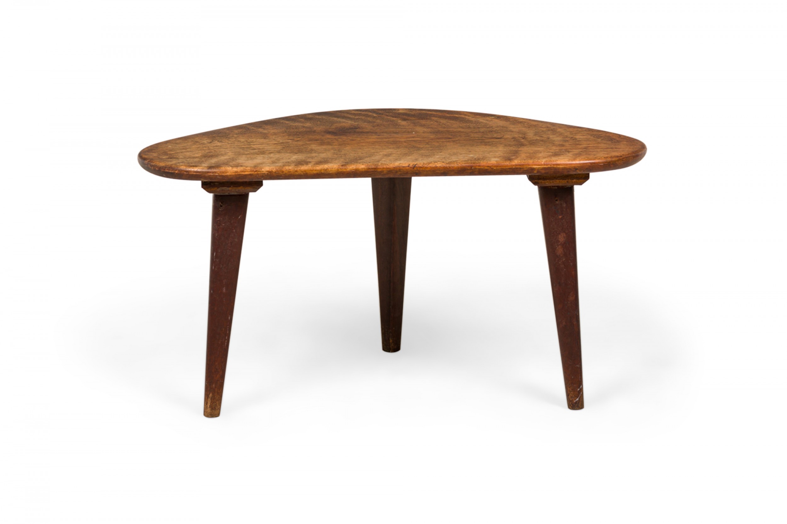 American Mid-Century walnut occasional table with a triangular top with rounded corners, resting on three squared and tapered legs..
