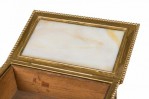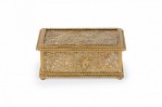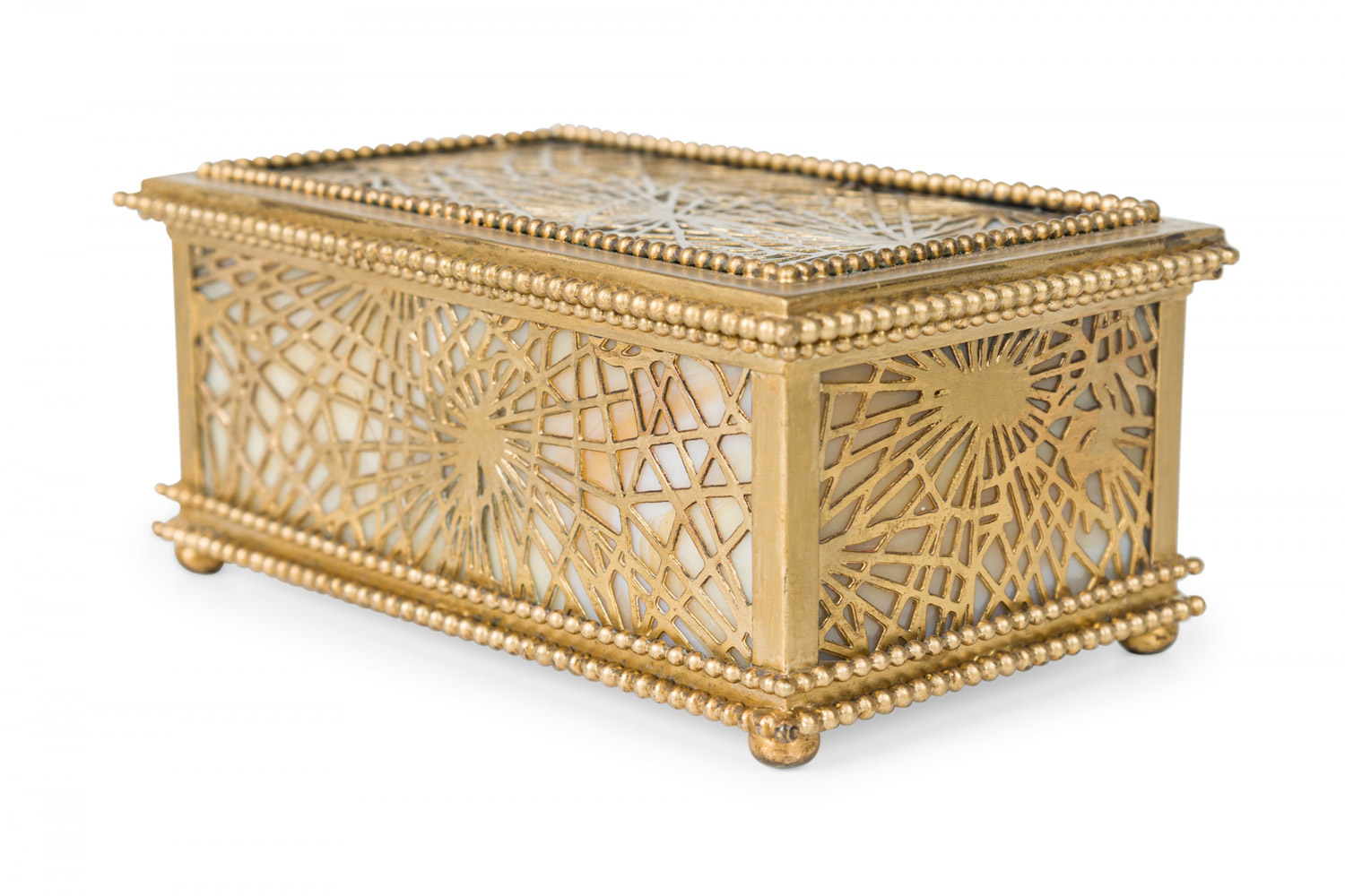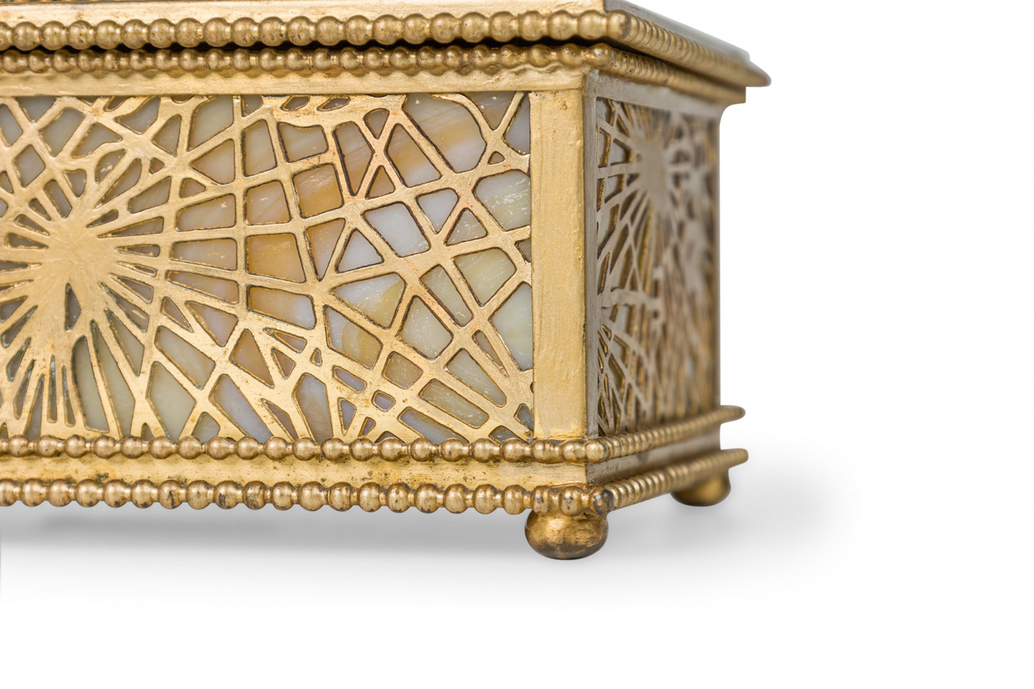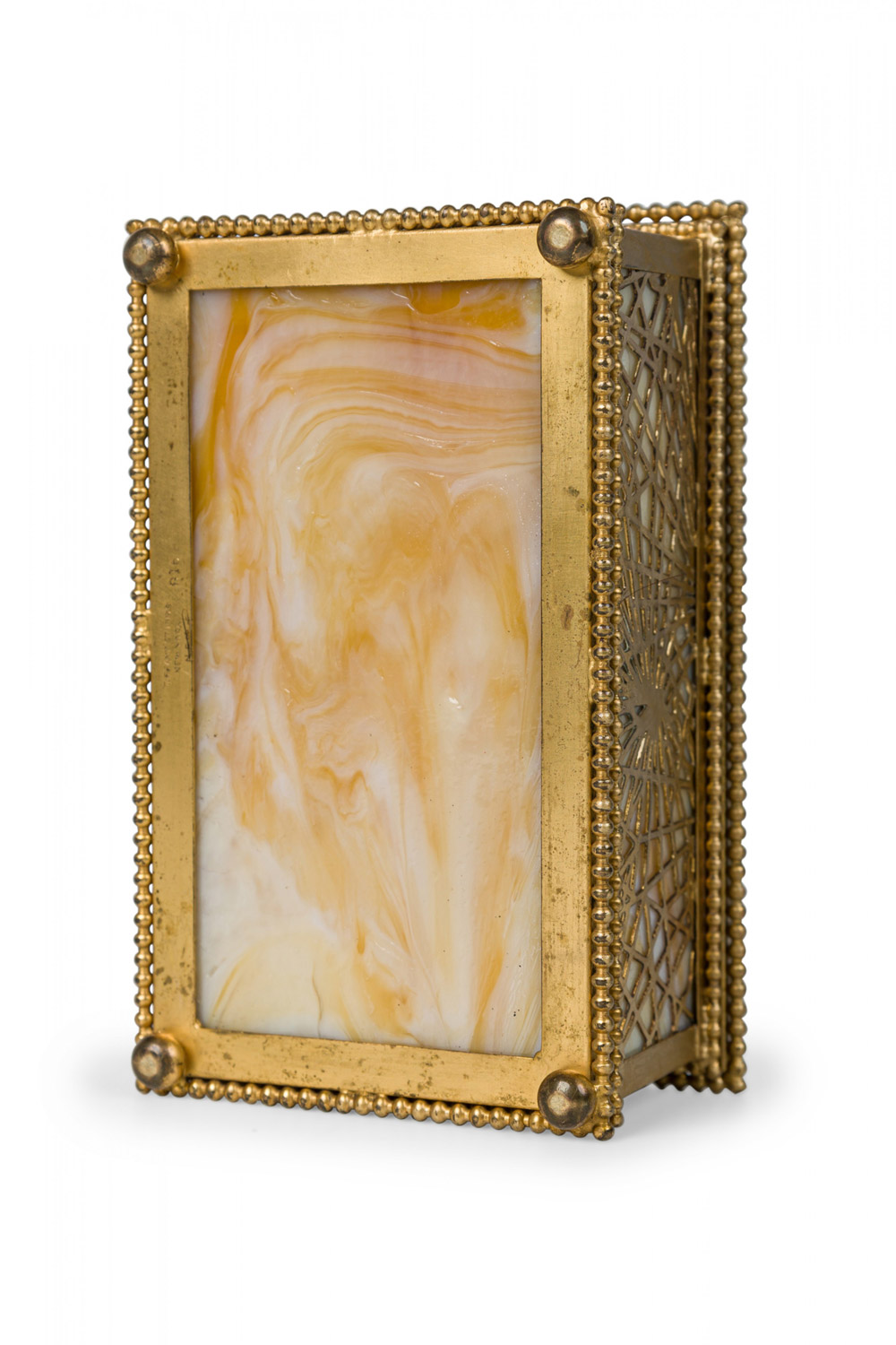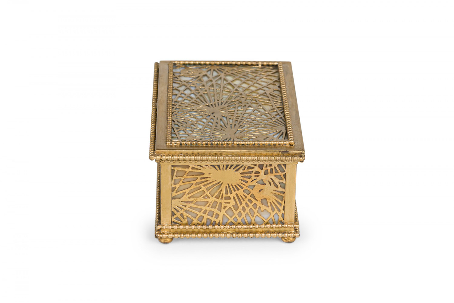 American Mission Tiffany rectangular bronze spider web filigree box with glass panel interior
