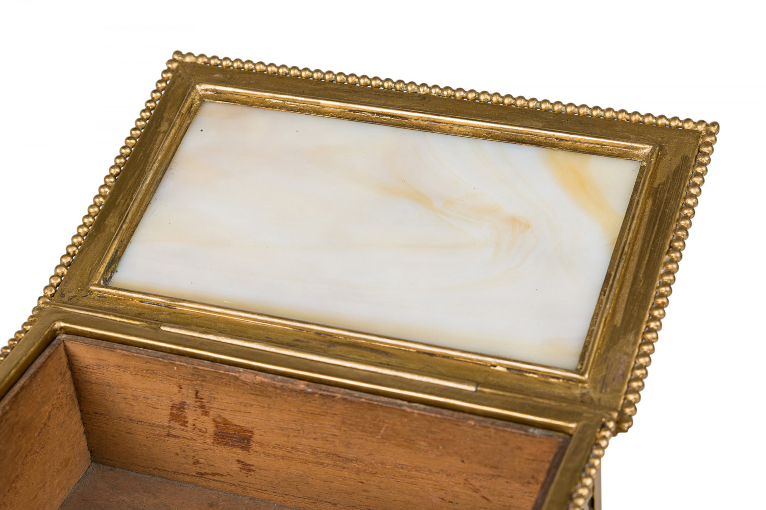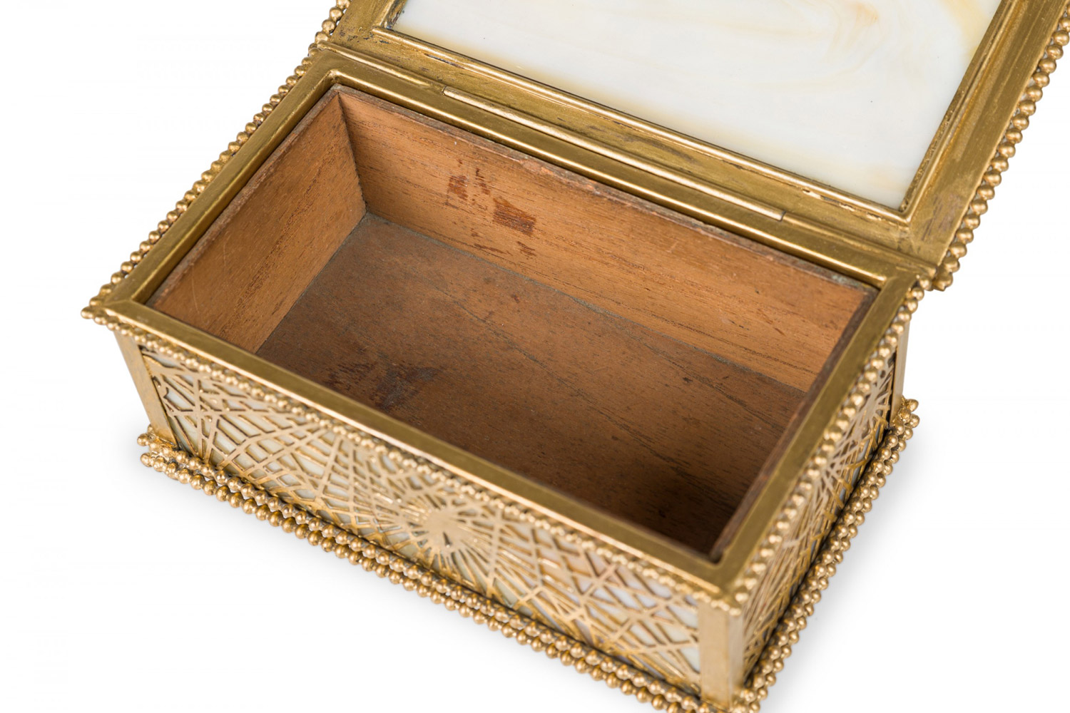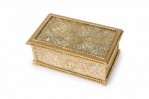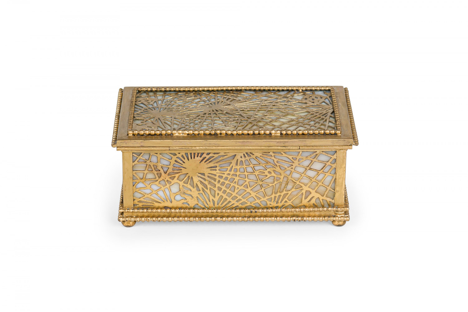 American Mission Tiffany rectangular bronze spider web filigree box with glass panel interior.