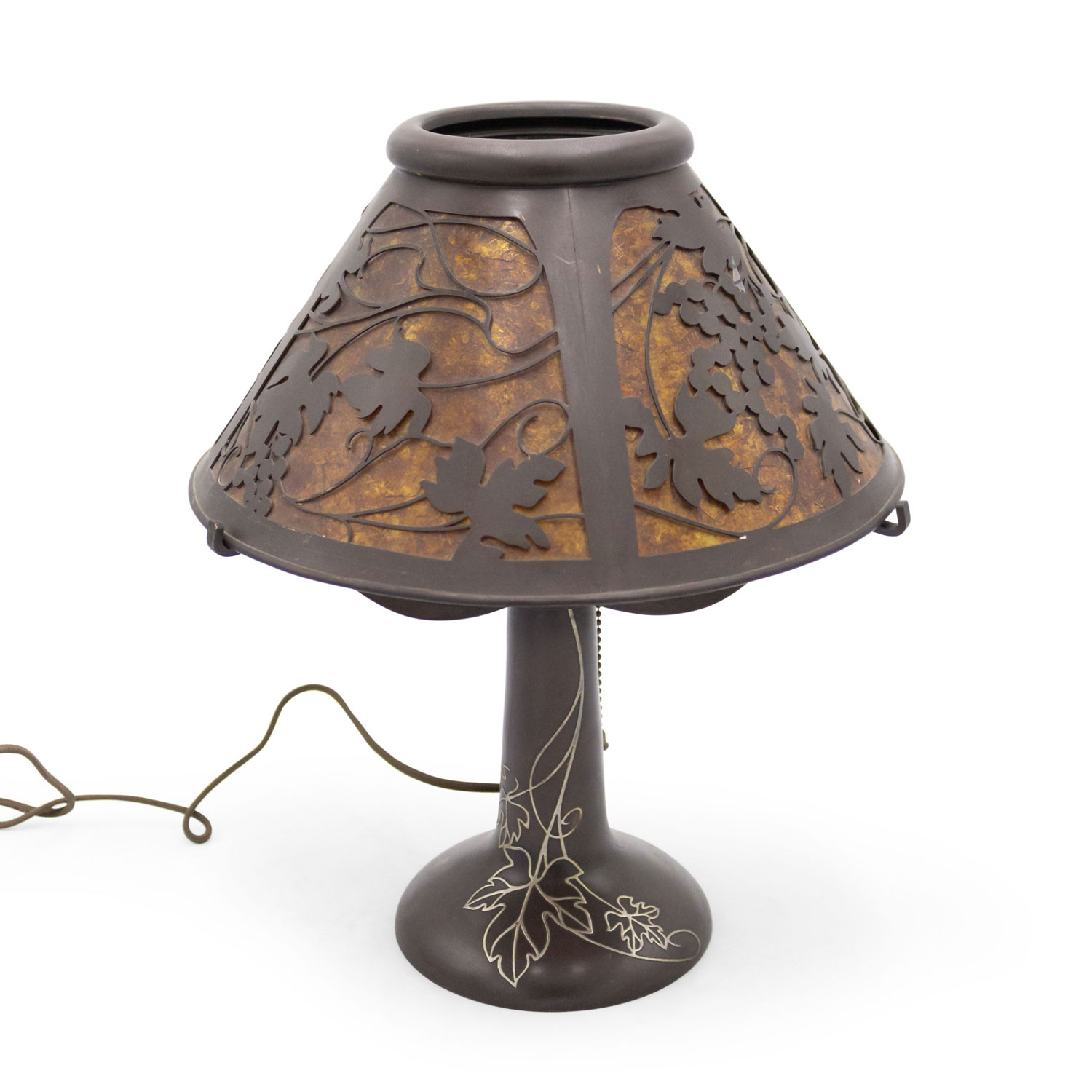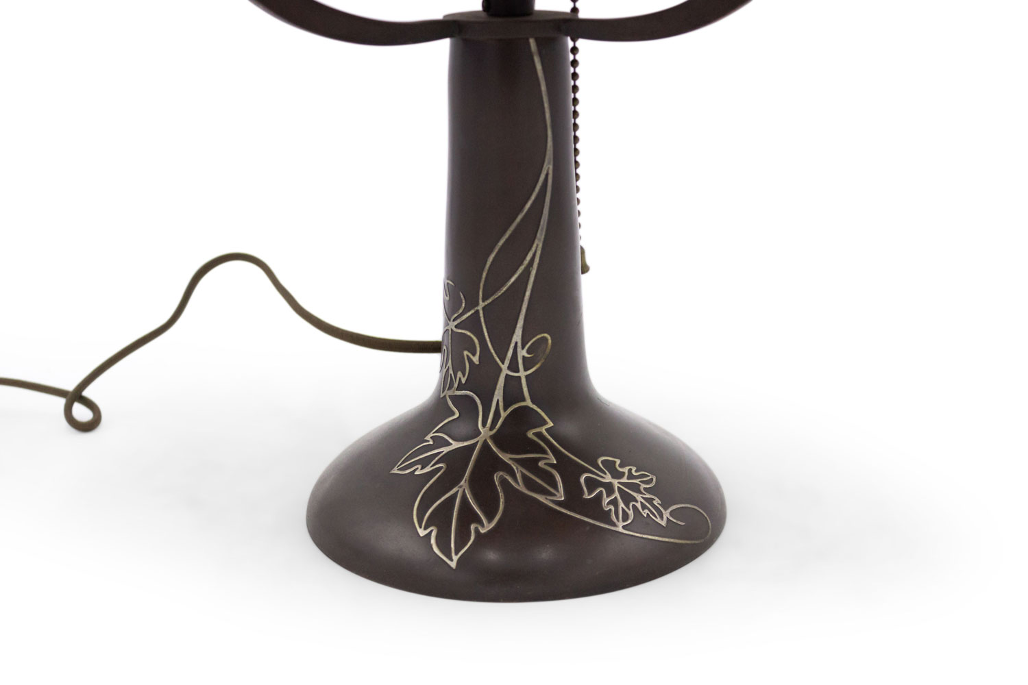 American Mission bronze brown patina table lamp with grape leaf silver deposit design on base and natural mica shade with filigree grape vine overlay (HEINTZ ART METAL)..