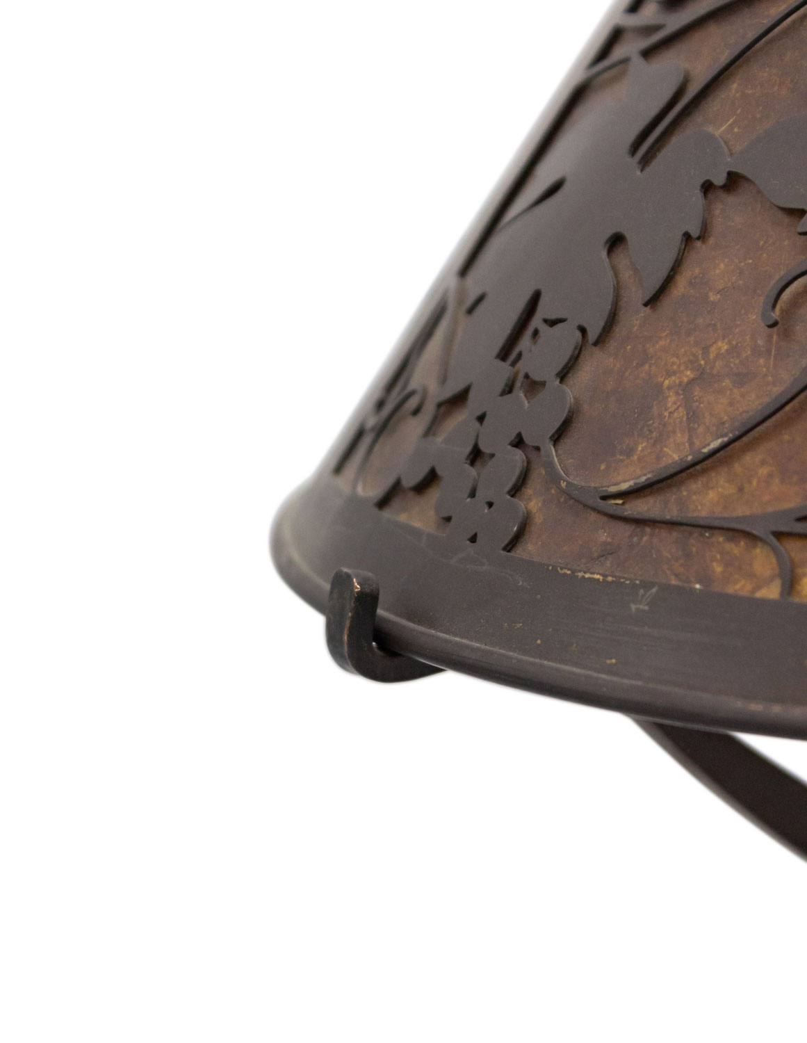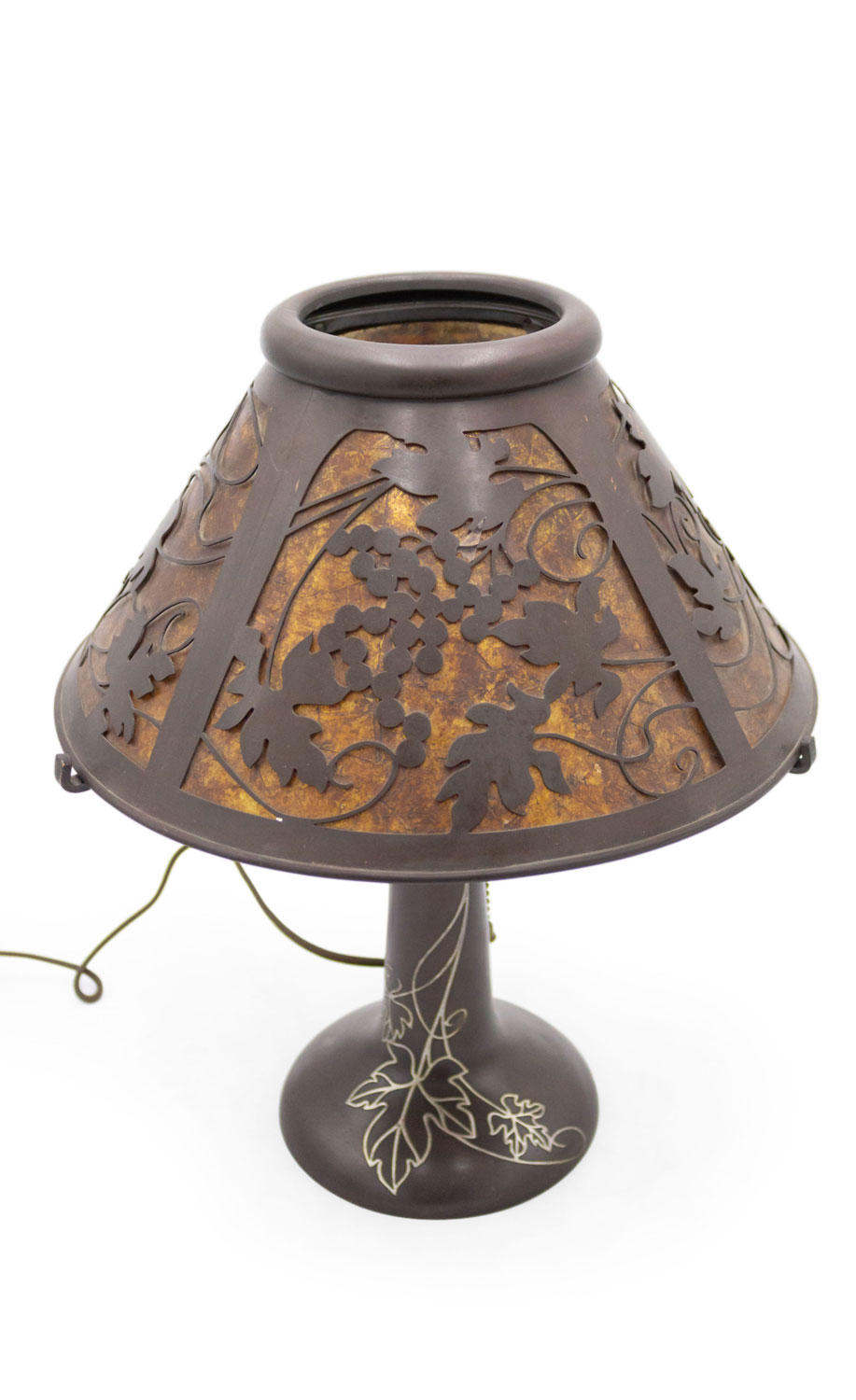 American Mission bronze brown patina table lamp with grape leaf silver deposit design on base and natural mica shade with filigree grape vine overlay (HEINTZ ART METAL).