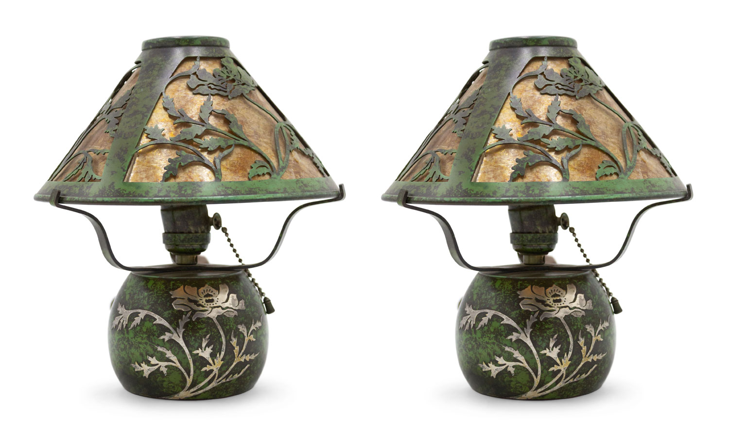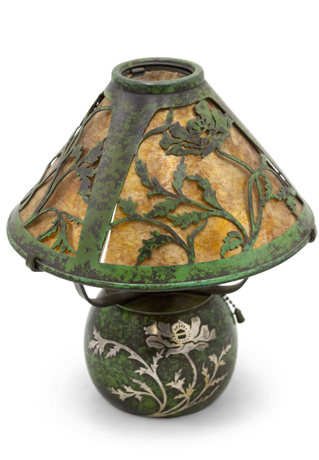 PAIR of American Mission bronze green patina boudoir table lamps with floral silver deposit on base and filigree mica shade (HEINTZ ART METAL) (PRICED AS PAIR).