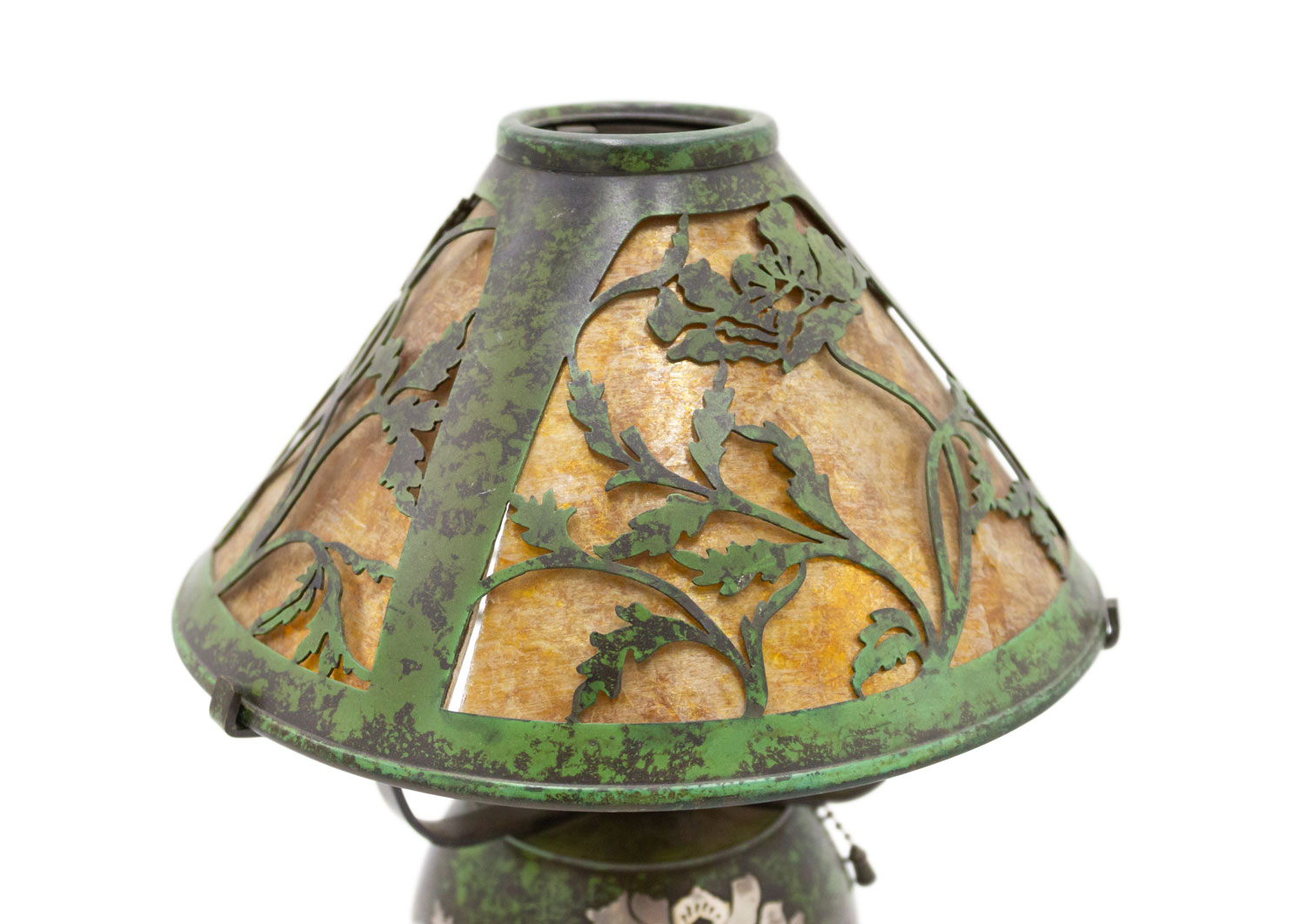PAIR of American Mission bronze green patina boudoir table lamps with floral silver deposit on base and filigree mica shade (HEINTZ ART METAL) (PRICED AS PAIR)..