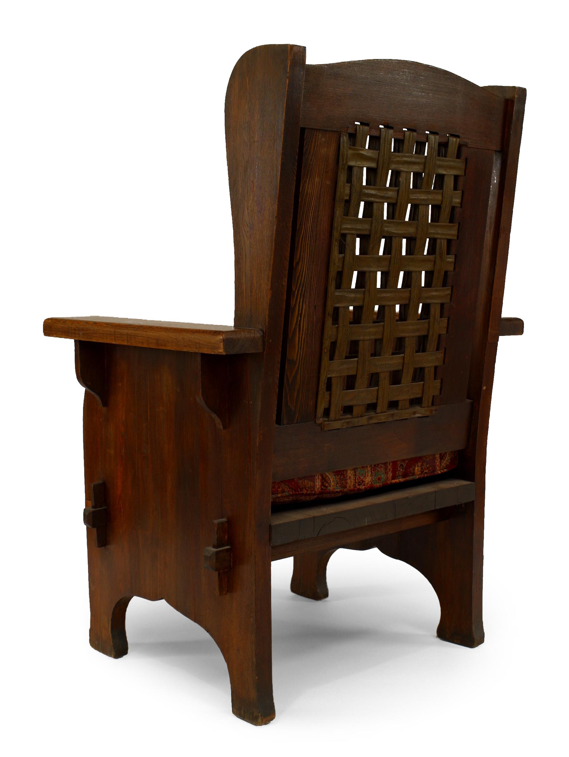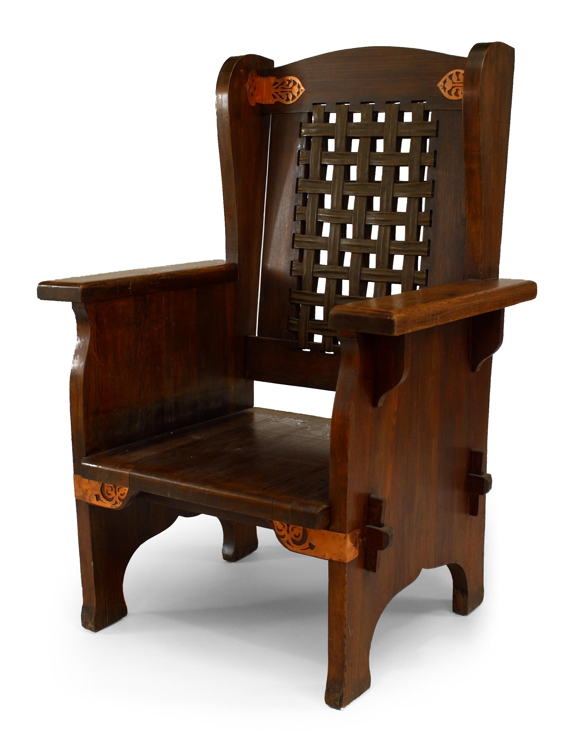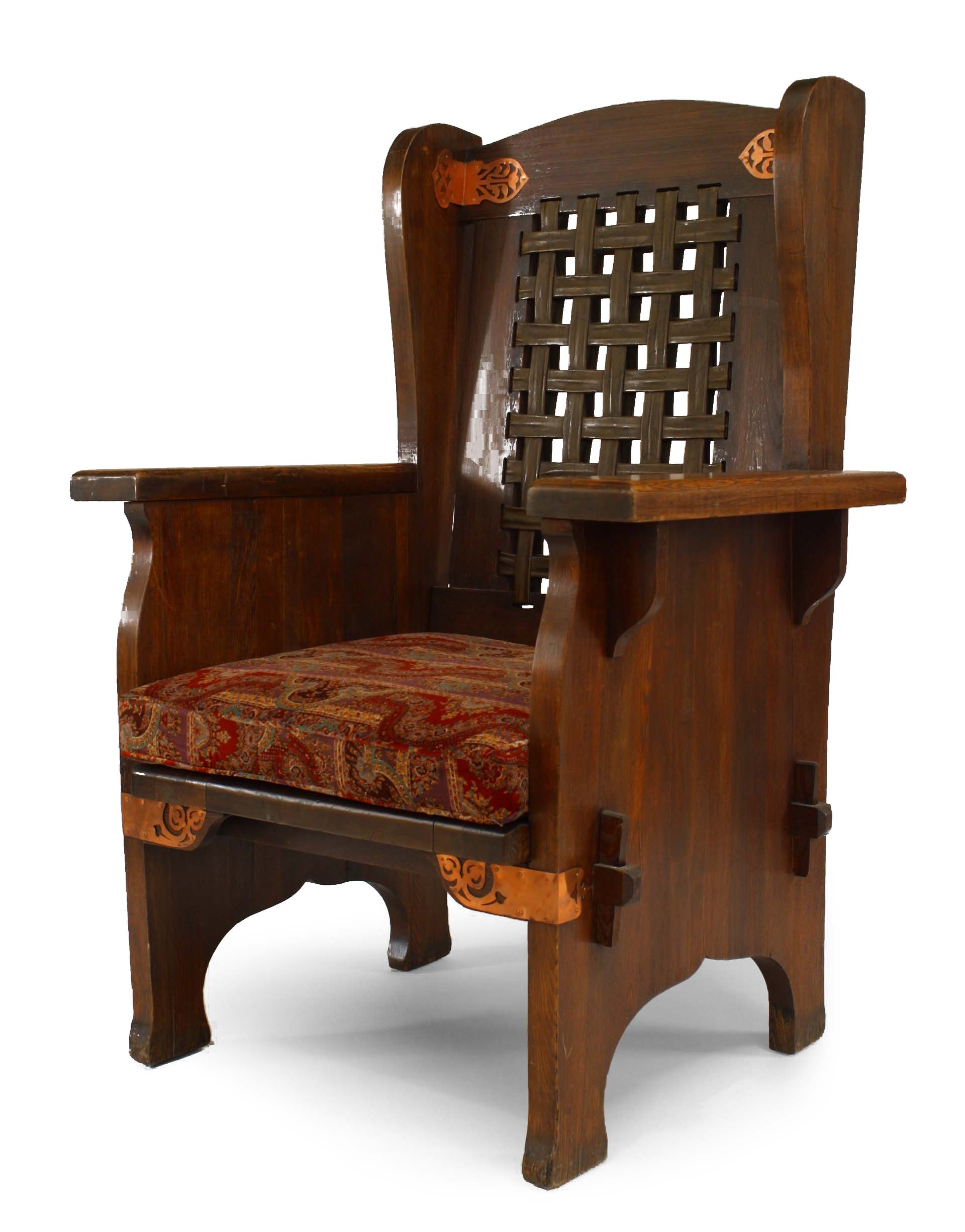 American Mission stained oak wing chair with decorative copper trim and leather mesh back with paisley seat cushion (Dexter Furniture Co., Black River).