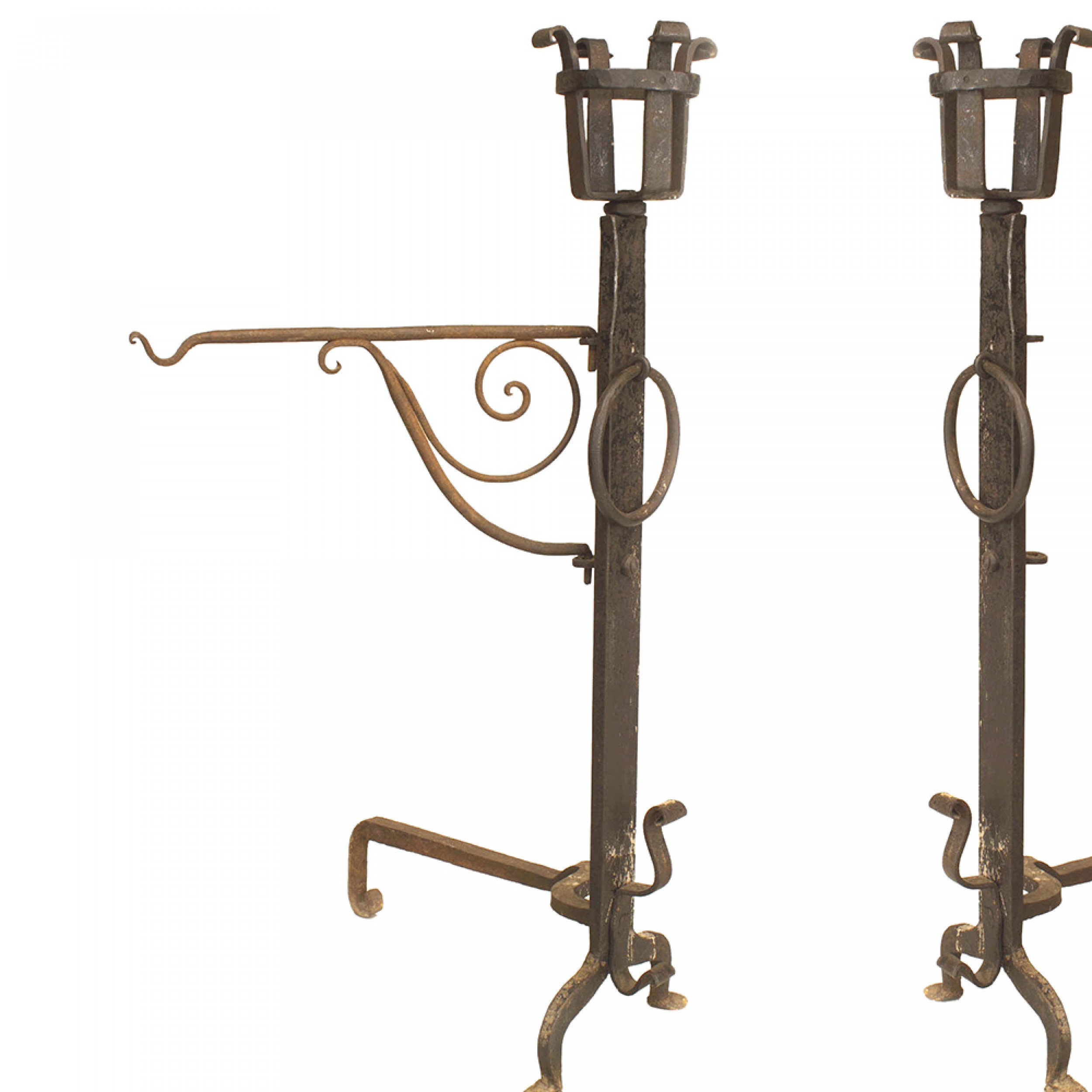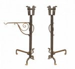 PAIR of American Mission-style (19/20th Century) monumental wrought iron andirons with basket tops and a detachable swivel kettle holder. (PRICED AS PAIR).