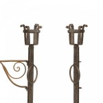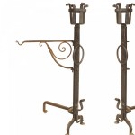 PAIR of American Mission-style (19/20th Century) monumental wrought iron andirons with basket tops and a detachable swivel kettle holder. (PRICED AS PAIR)