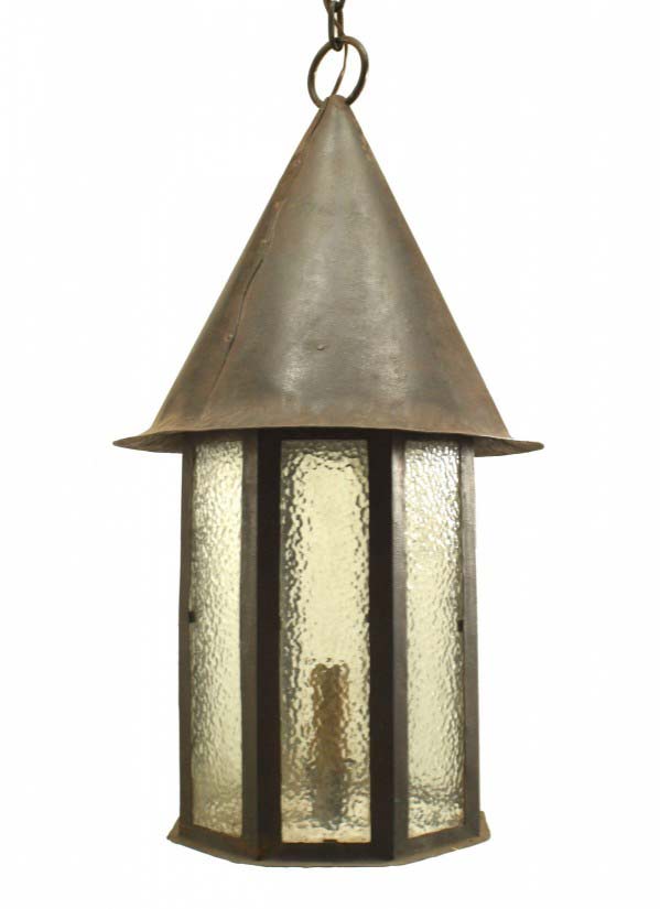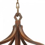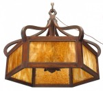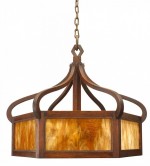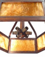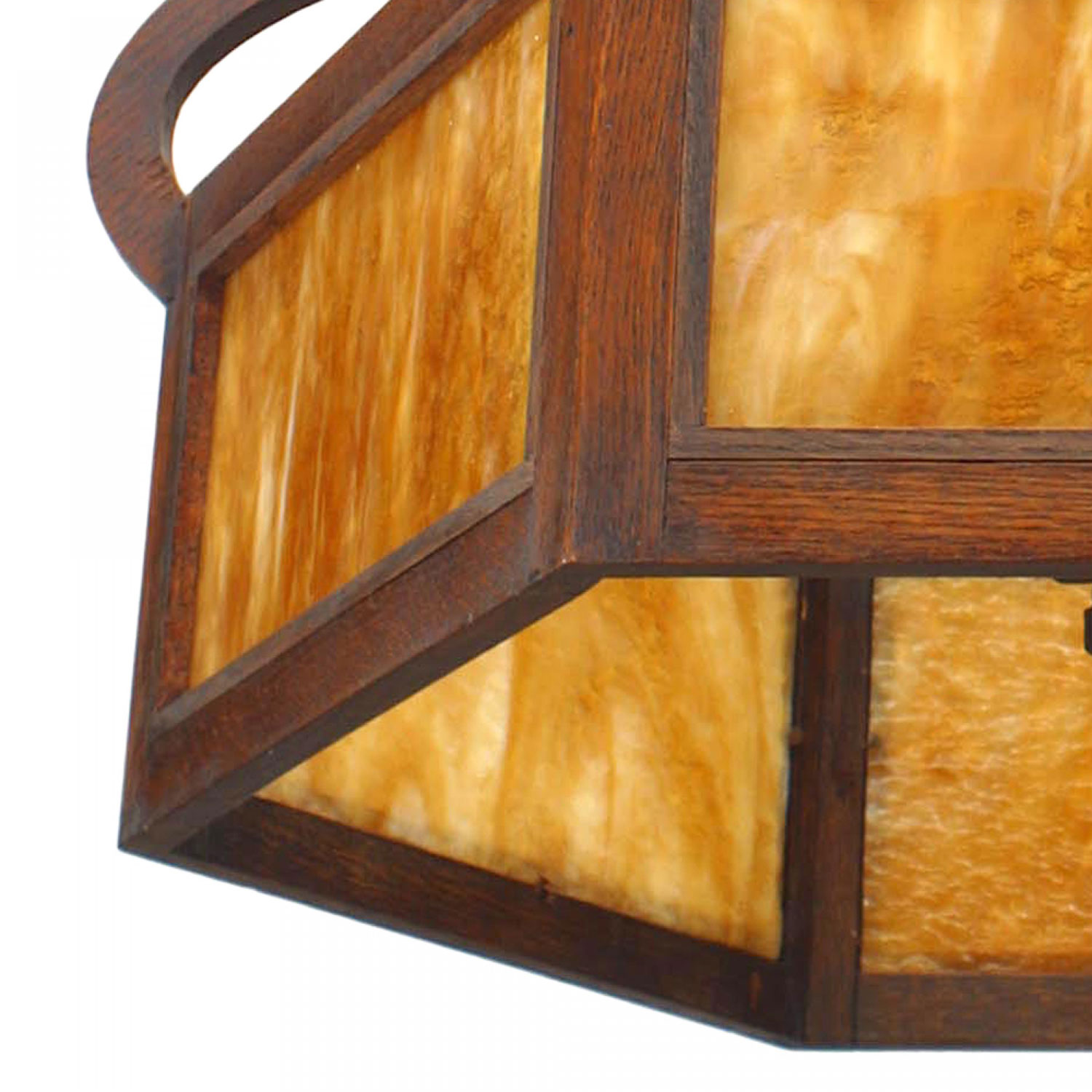 American Mission 6 sided chandelier with stained oak framed caramel slag glass panels supported by a canopy with curved design supports..
