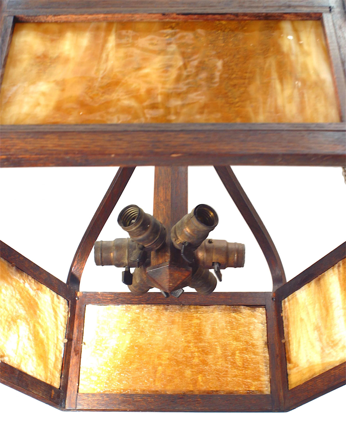 American Mission 6 sided chandelier with stained oak framed caramel slag glass panels supported by a canopy with curved design supports.