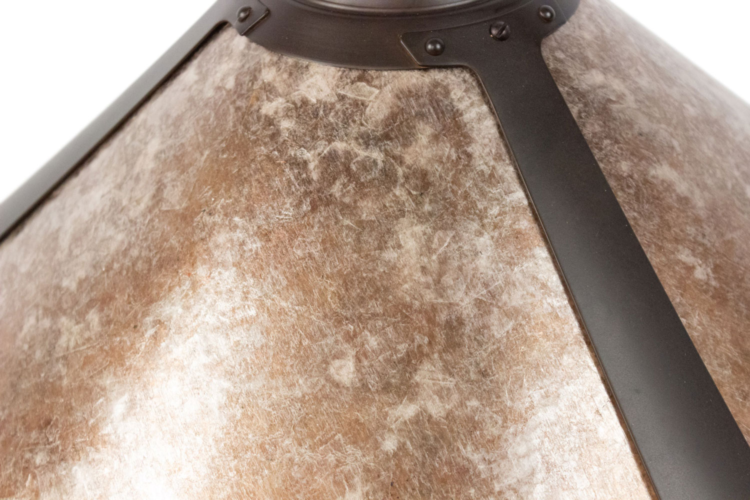 American Mission style table lamp with a 3 panel mica and metal shade supported on a brown patinaed tapered base..