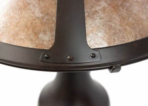 American Mission style table lamp with a 3 panel mica and metal shade supported on a brown patinaed tapered base.