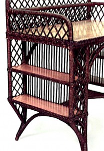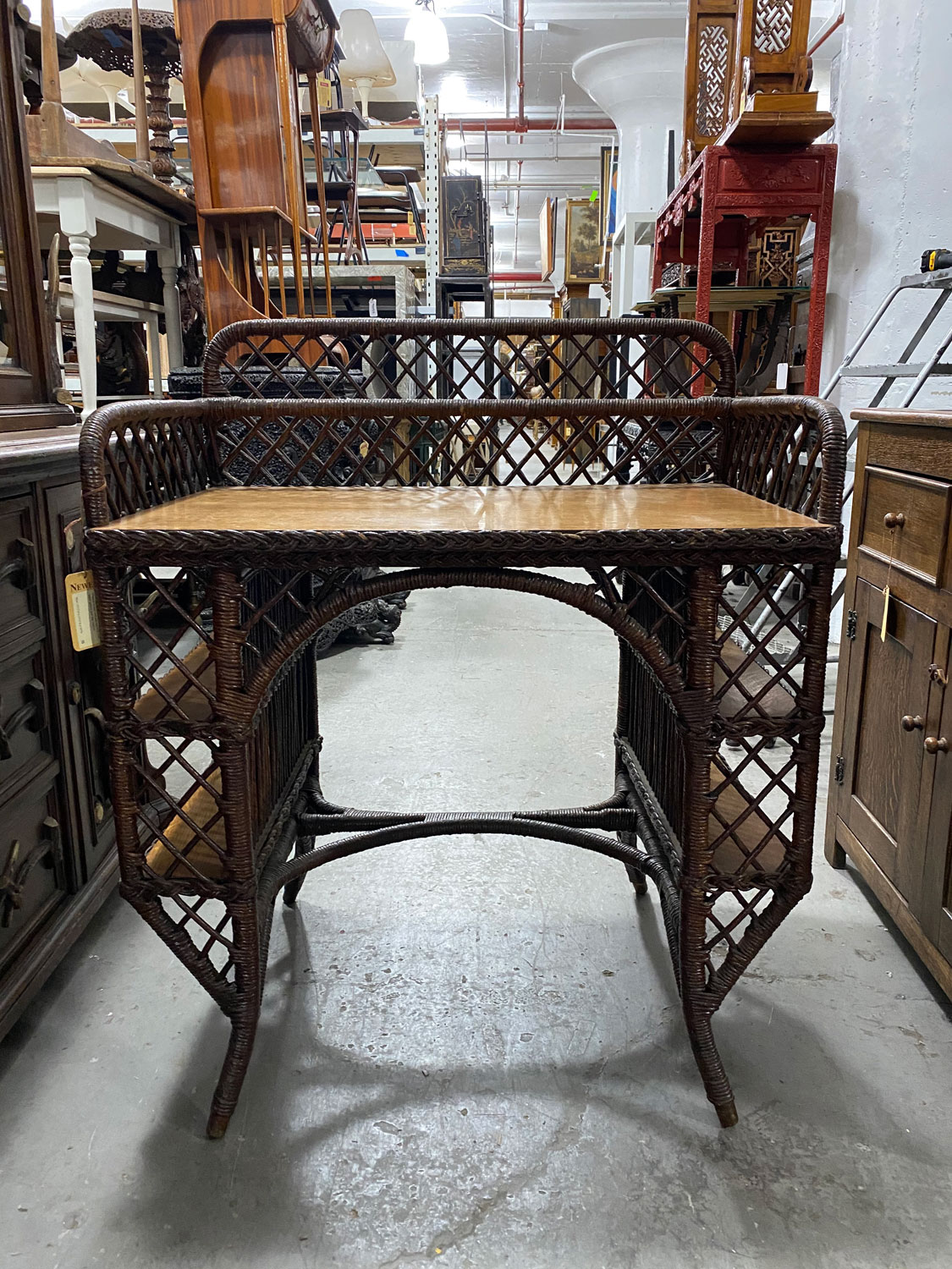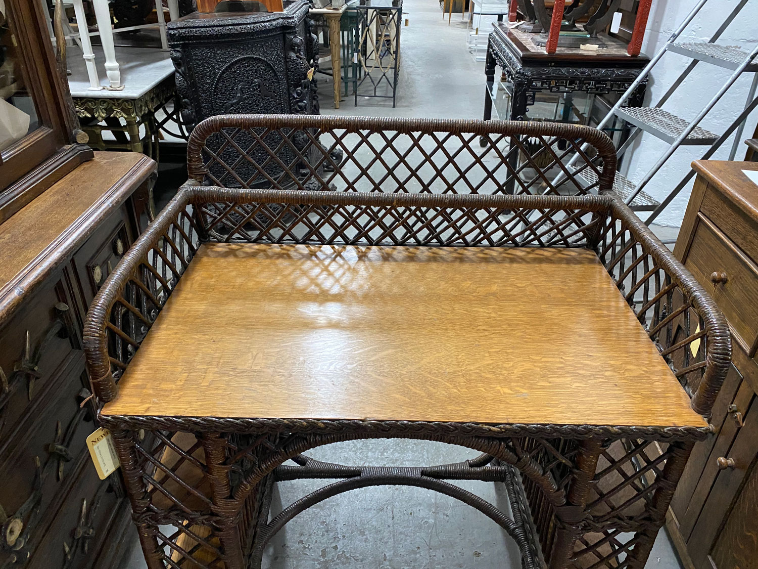 American Mission natural wicker and oak top desk with upper gallery and side shelves.