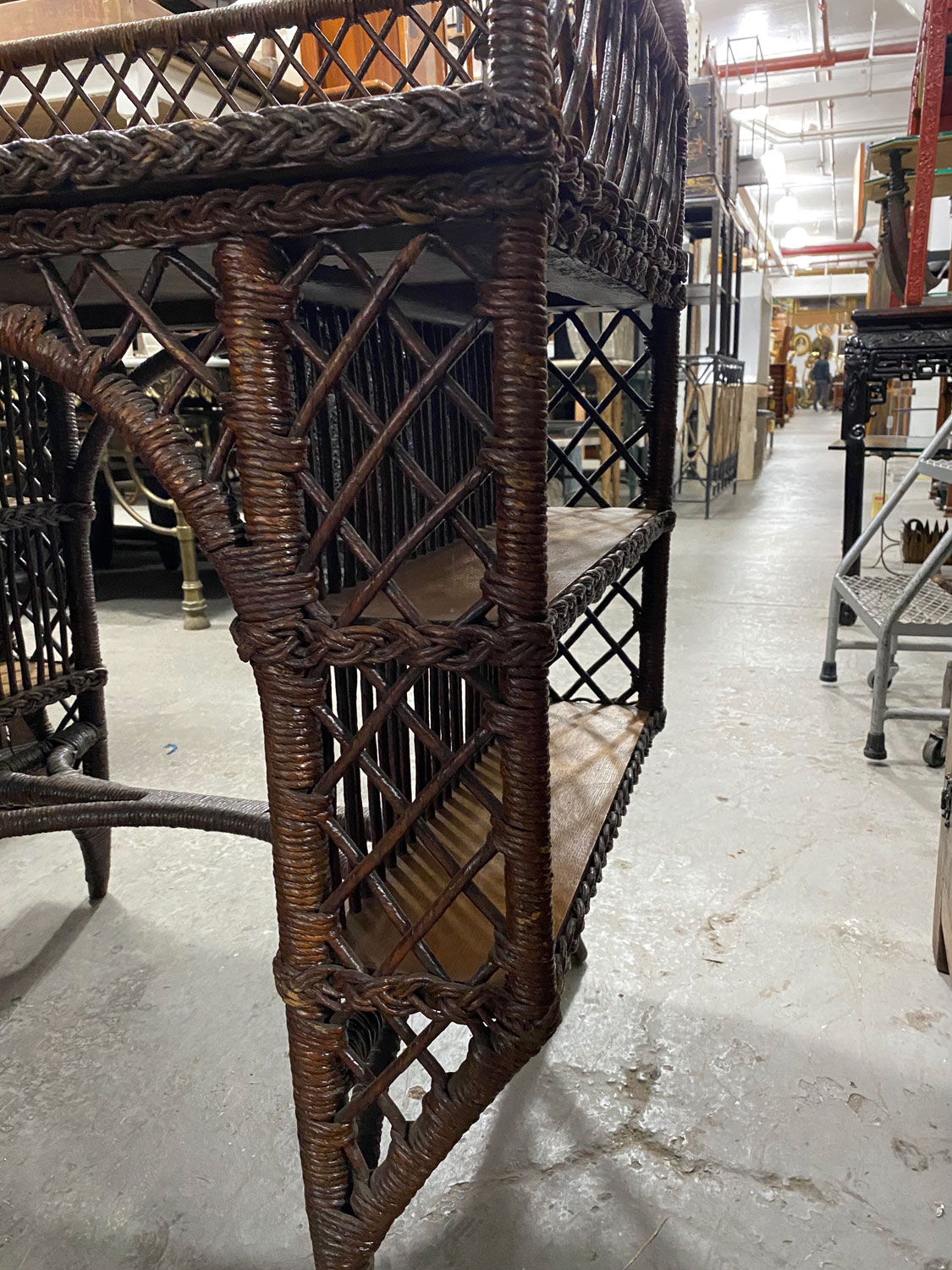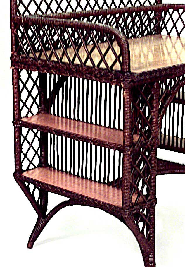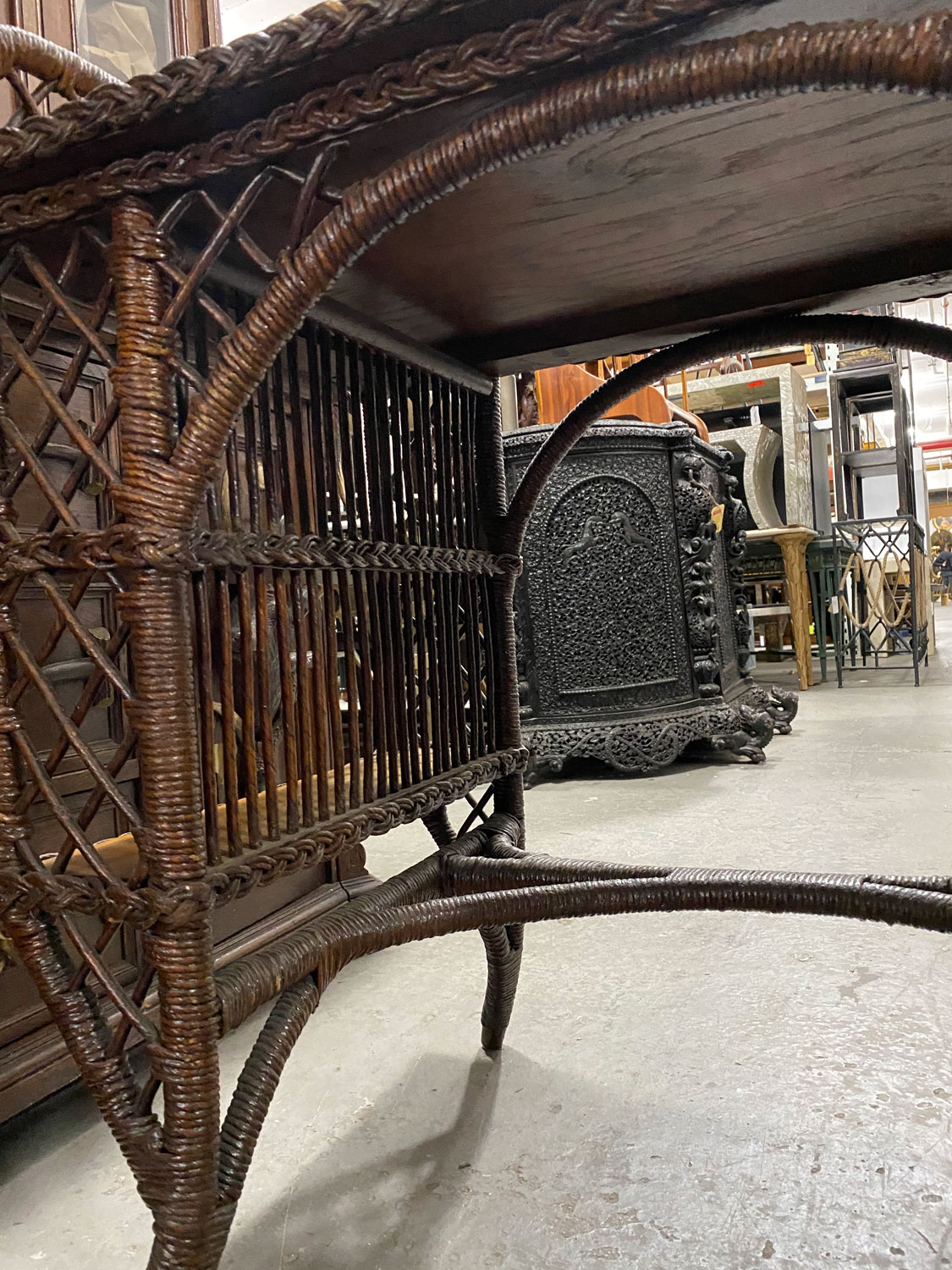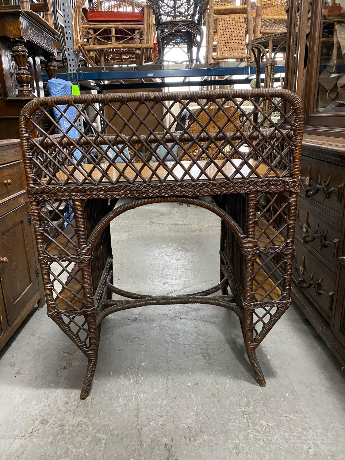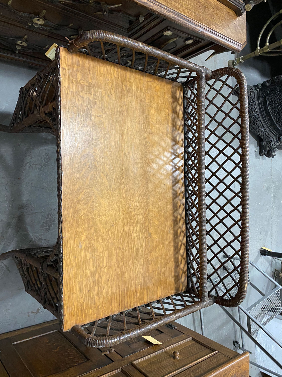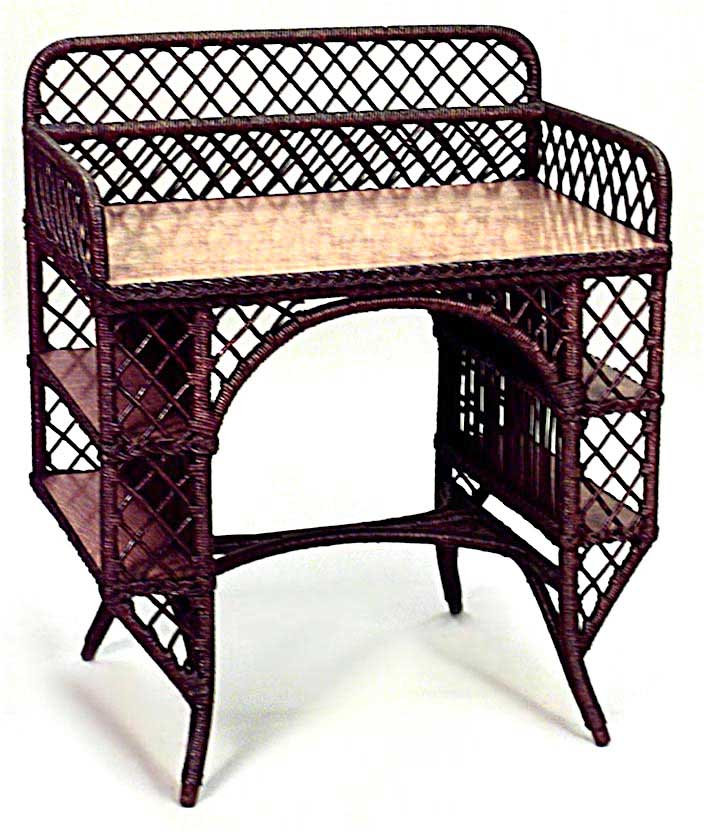 American Mission natural wicker and oak top desk with upper gallery and side shelves..