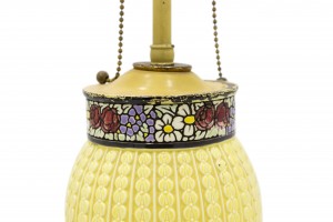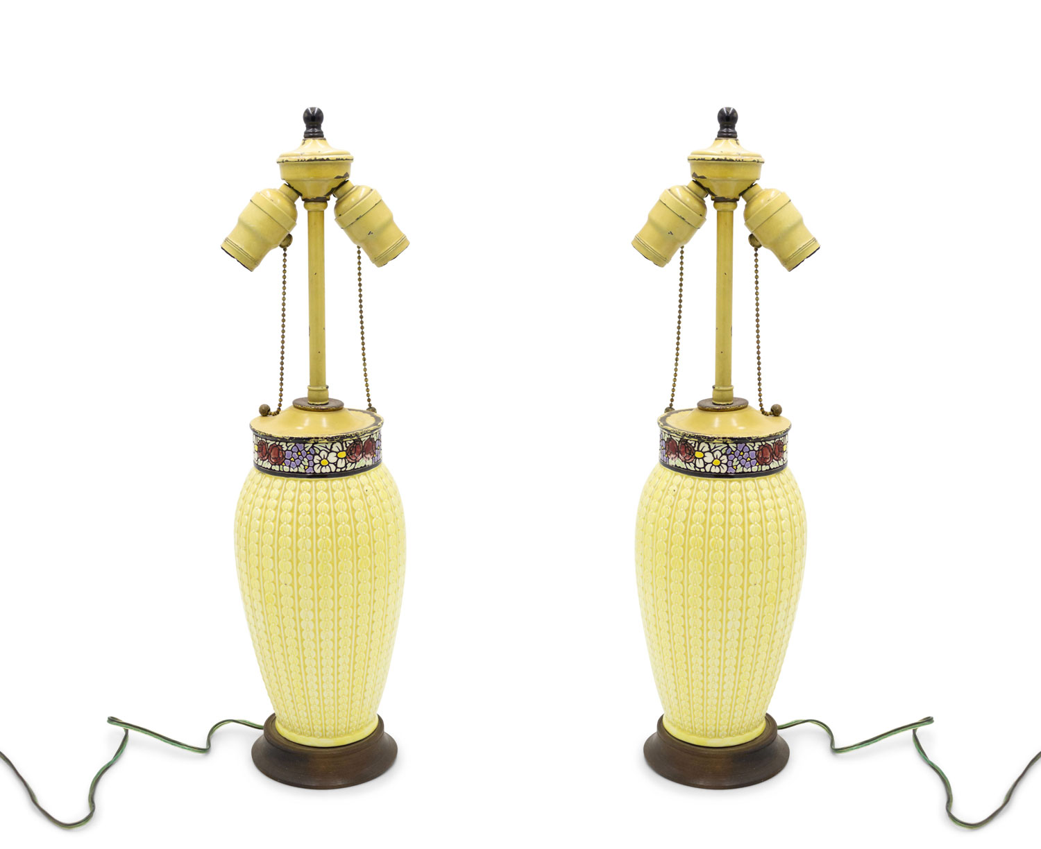 PAIR of American Arts and Crafts yellow fluted and shaped "corn" lamps with a floral decorated top and round wood base (PRICED AS PAIR).