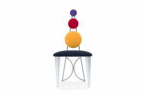 Set of 8 American Memphis-style (early 90s) metal framed side chairs with multicolored upholstered seats and backs having 3 round upholstered panels (Exhibited at Holiday House).