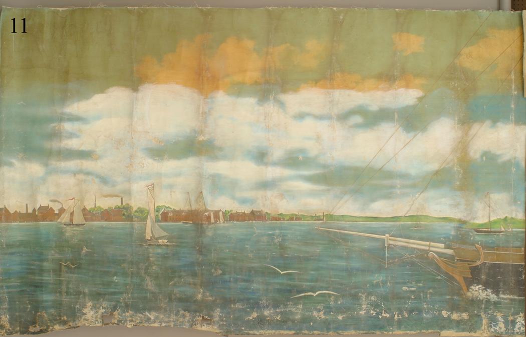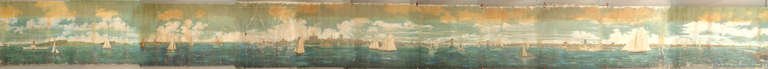 American (circa 1880) painted mural of a panoramic view of the New York City harbor with boats & city landmarks. Originally in the American Stock Exchange. 79 feet wide..