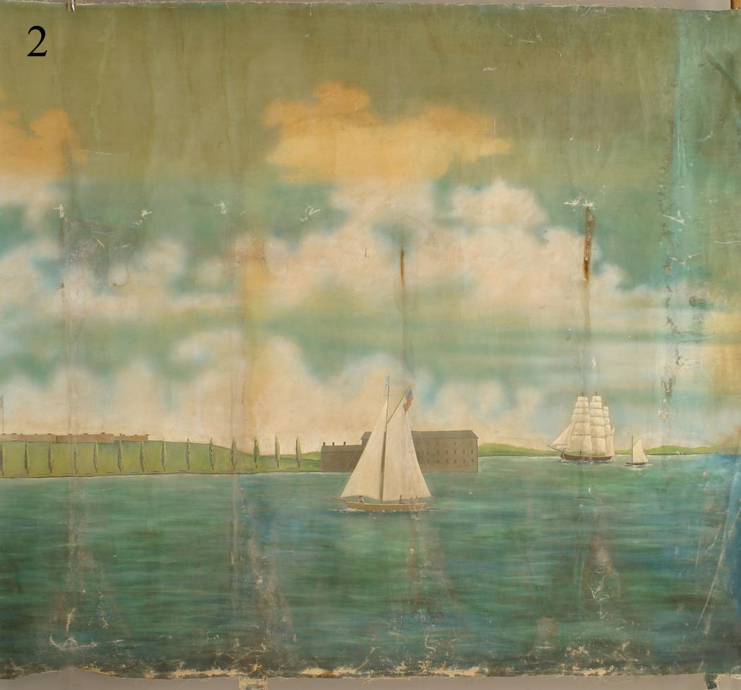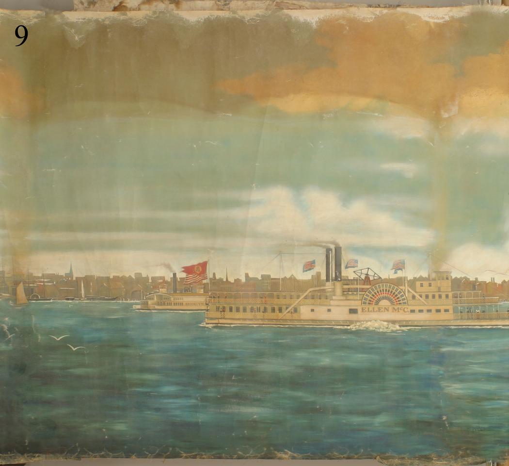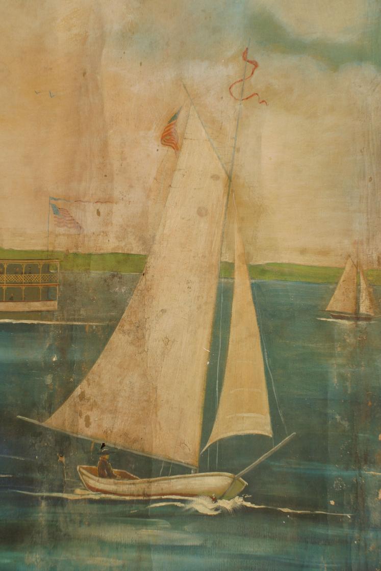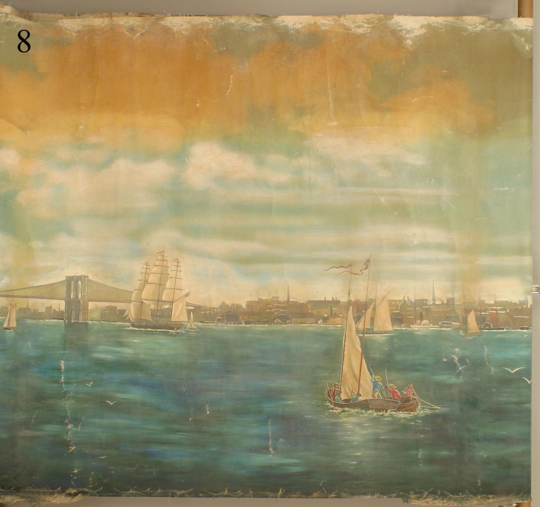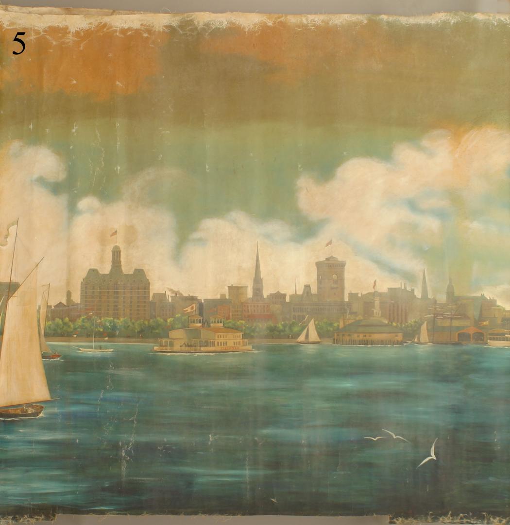 American (circa 1880) painted mural of a panoramic view of the New York City harbor with boats & city landmarks. Originally in the American Stock Exchange. 79 feet wide.