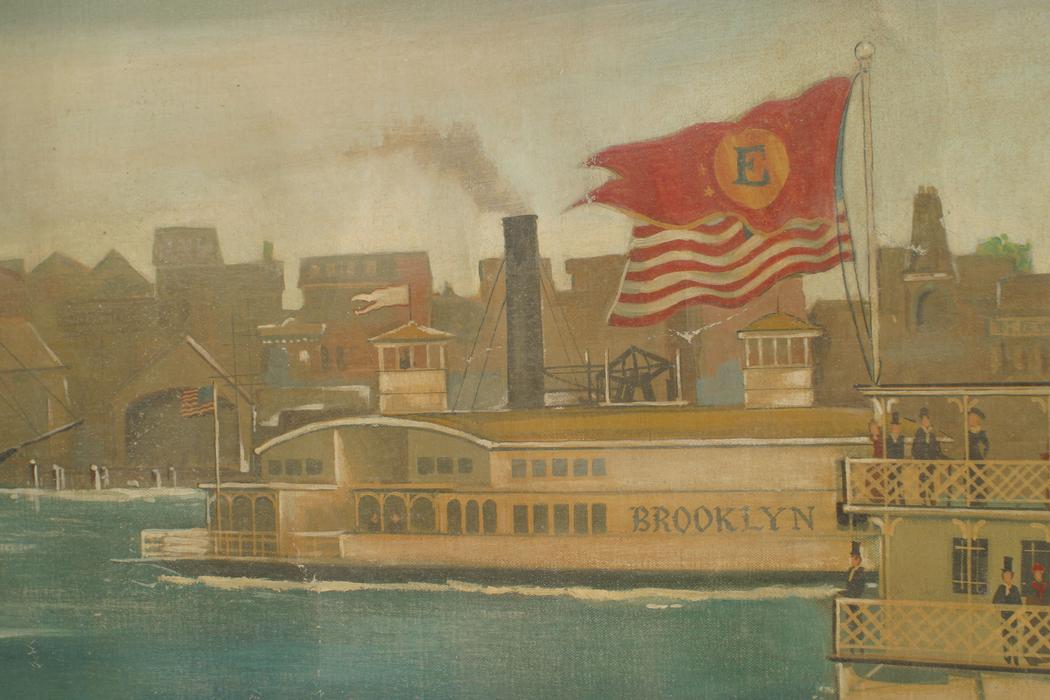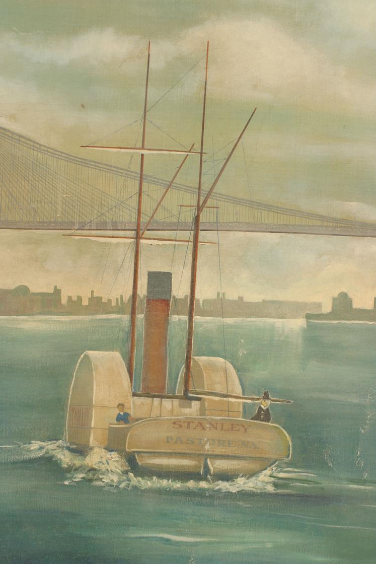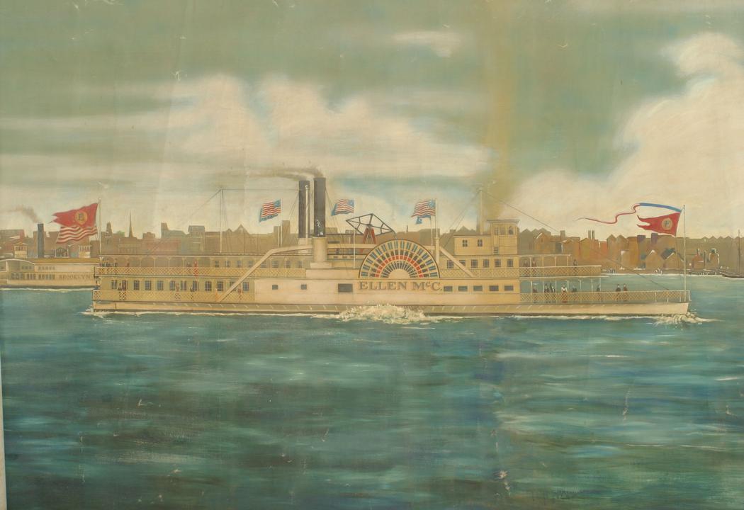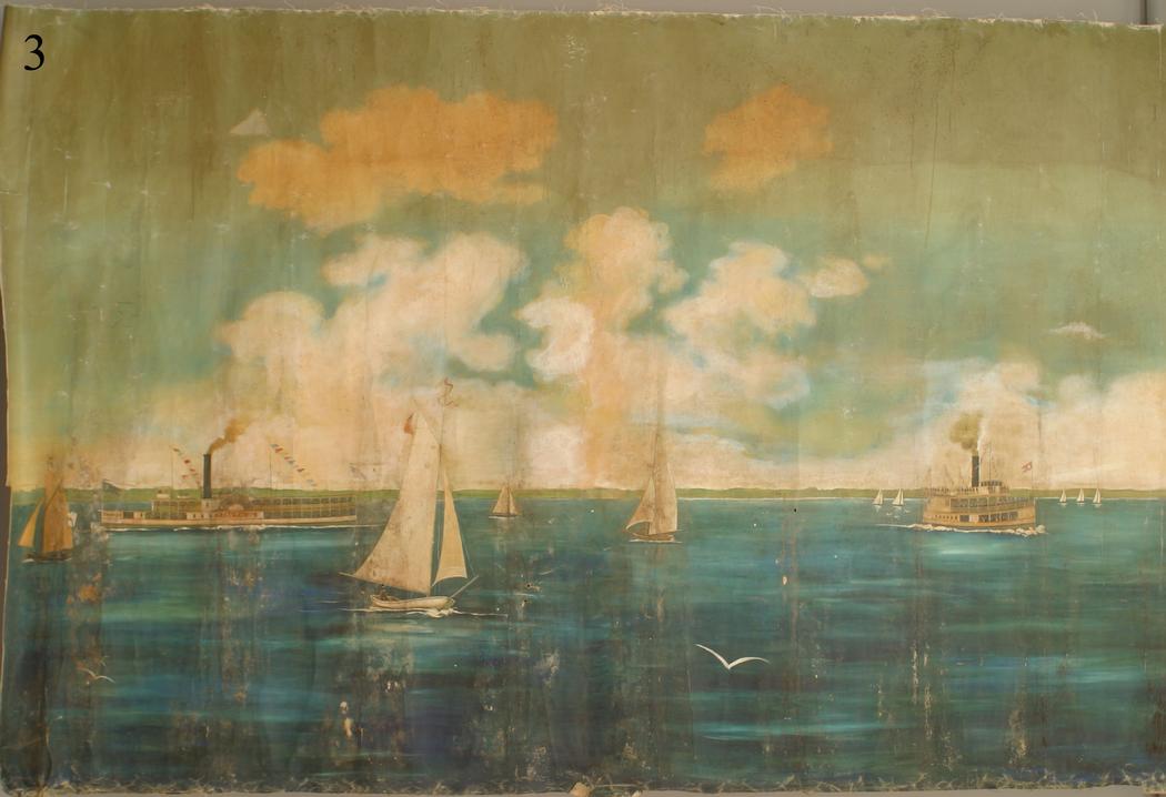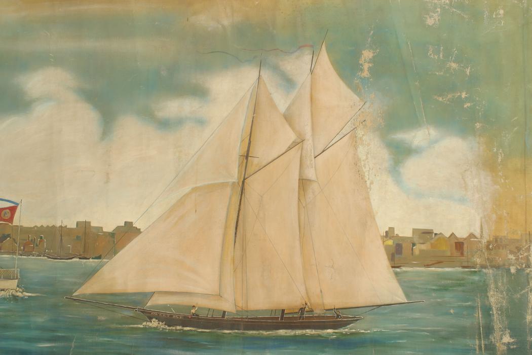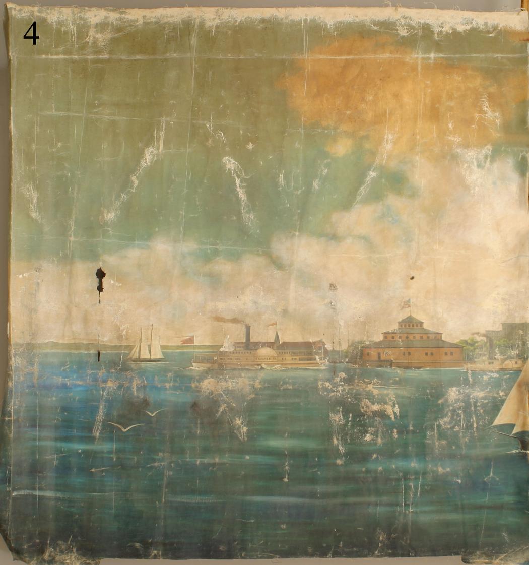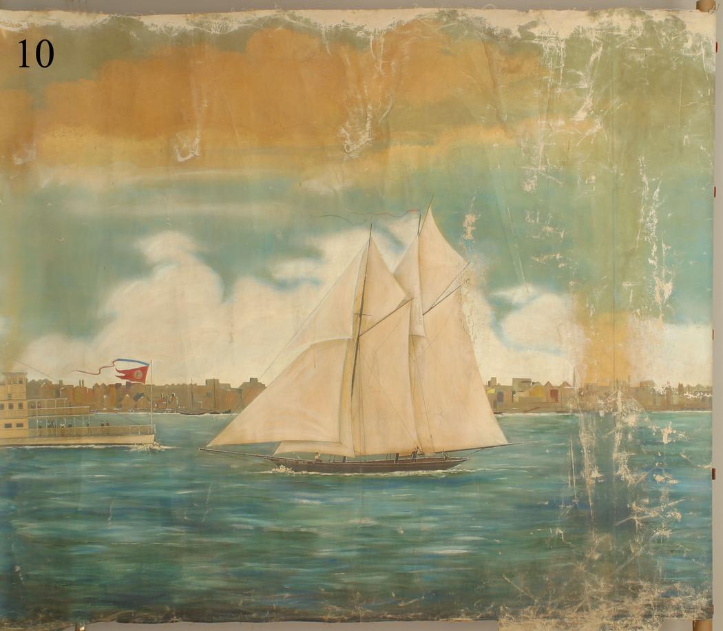 American (circa 1880) painted mural of a panoramic view of the New York City harbor with boats & city landmarks. Originally in the American Stock Exchange. 79 feet wide.
