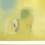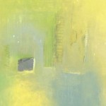 American Post-War Design abstract art, oil painting with shades of lime green in a pine frame.