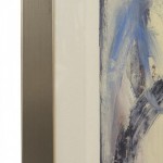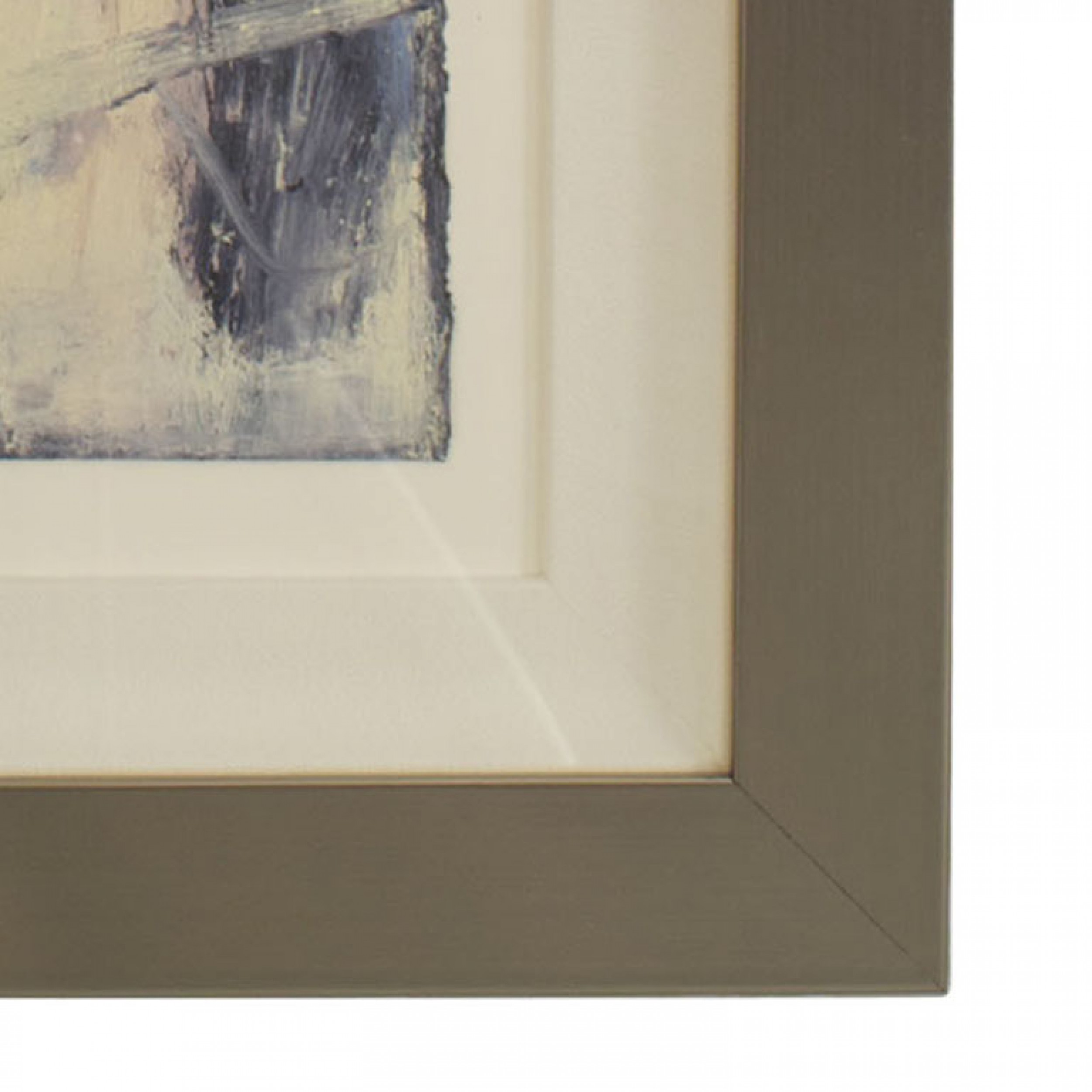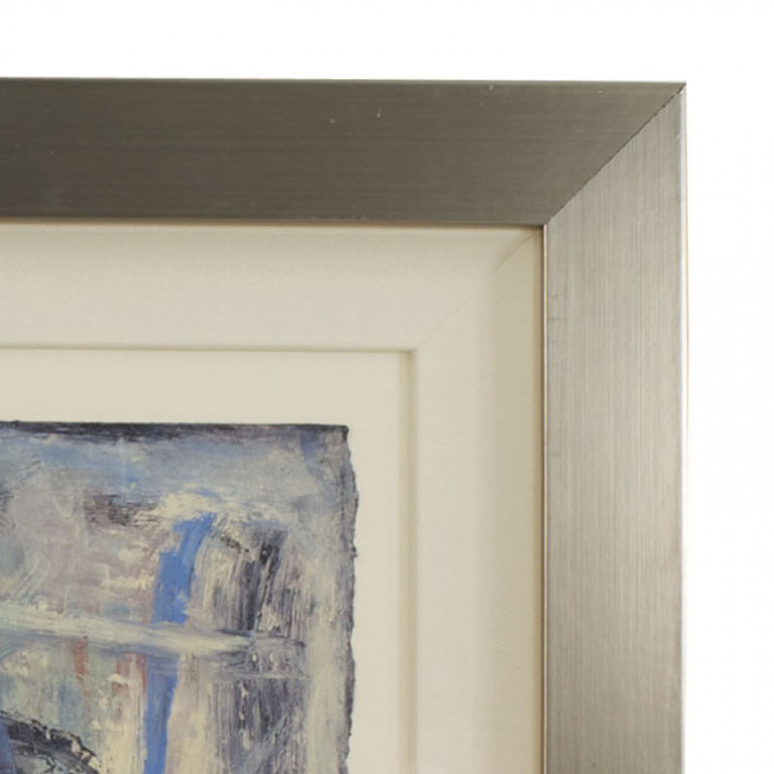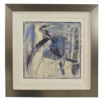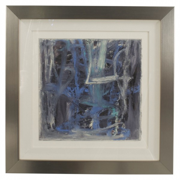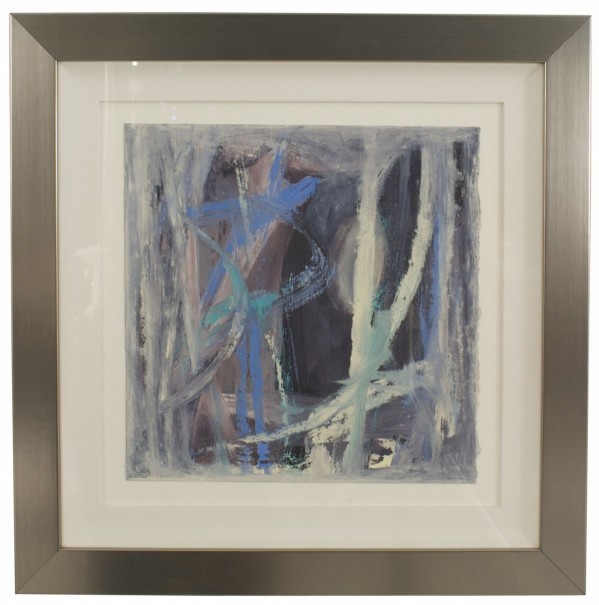 American Post-War Design abstract art, oil painting on paper with shades of multicolored blue & beige in a silver frame. (One of series of 4: BLO010A-D).