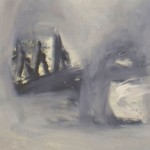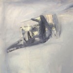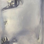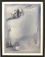 American Post War design abstract art, oil painting of predominantly gray field w/ darker accents in black frame.