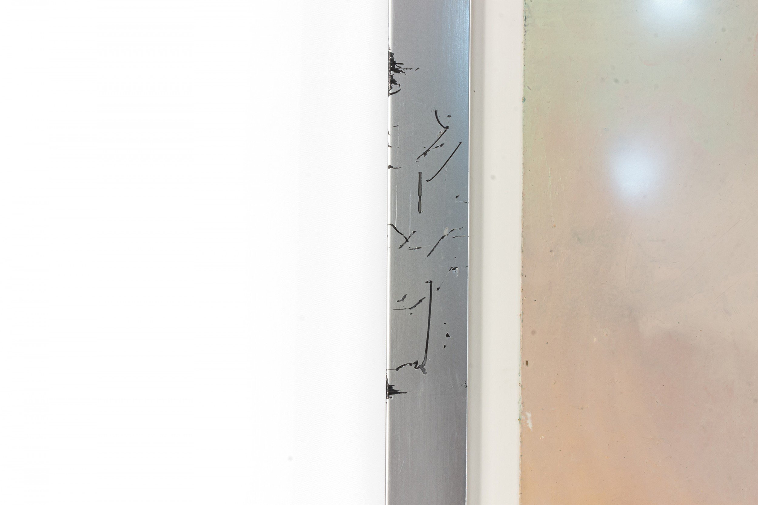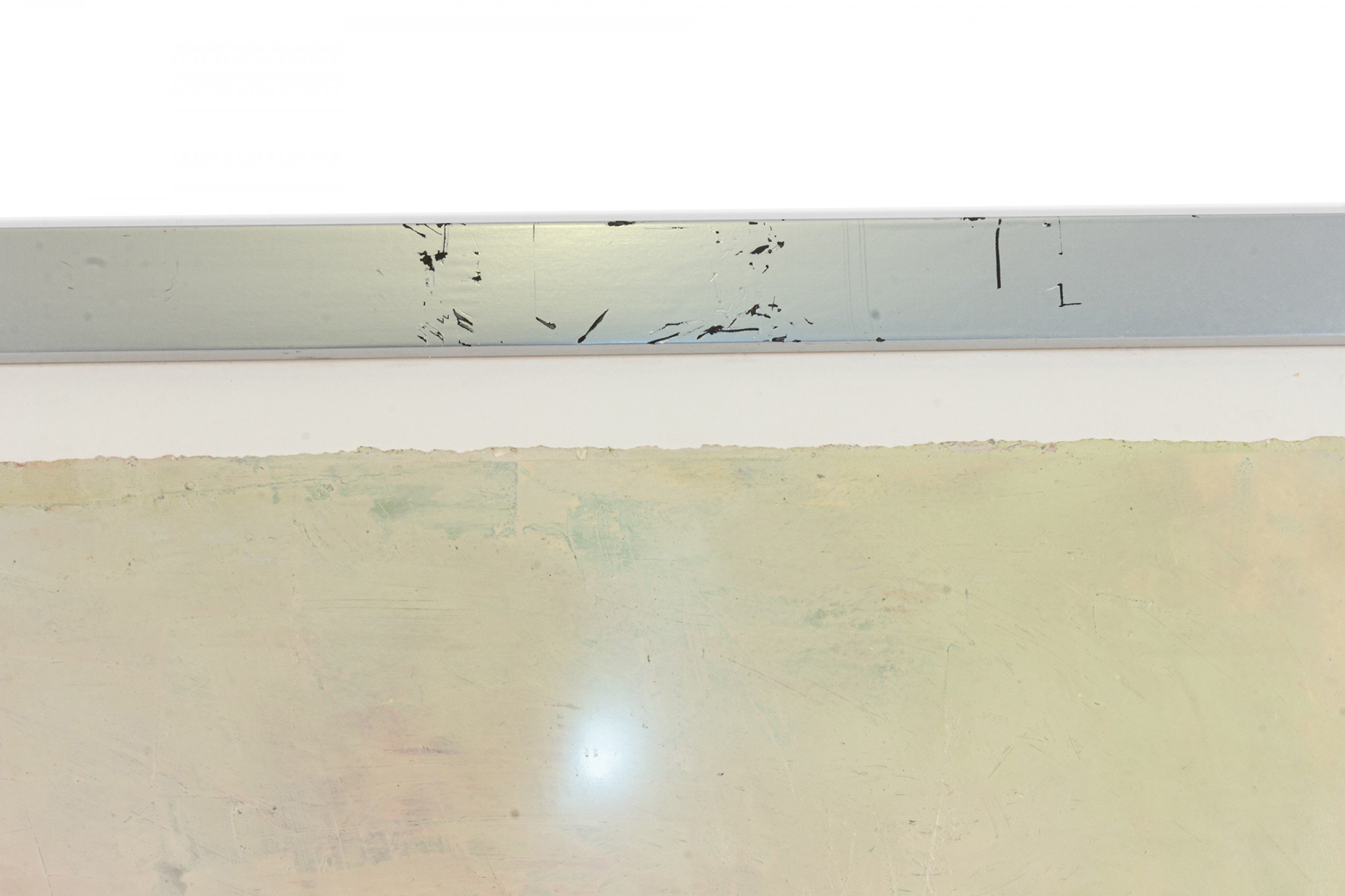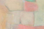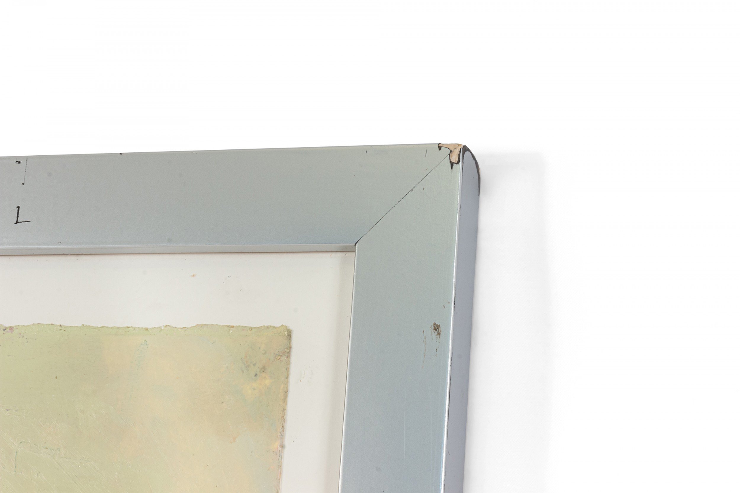 American Post War design abstract art, oil painting of pink, green, orange and beige shapes in a silver frame.