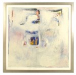 American Post-War Design abstract art, oil painting with shades of purple on white in a silver frame..
