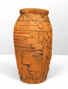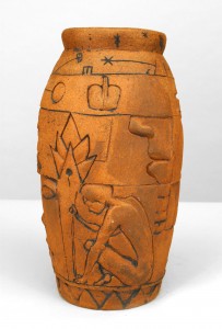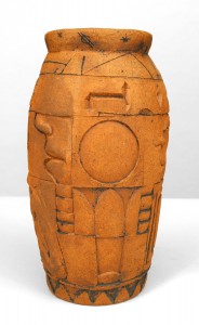 American Post-War Design terra cotta Egyptian design vase with hieroglyphics in carved relief with faces, symbols and birds (signed by ROBERT BENTLEY).