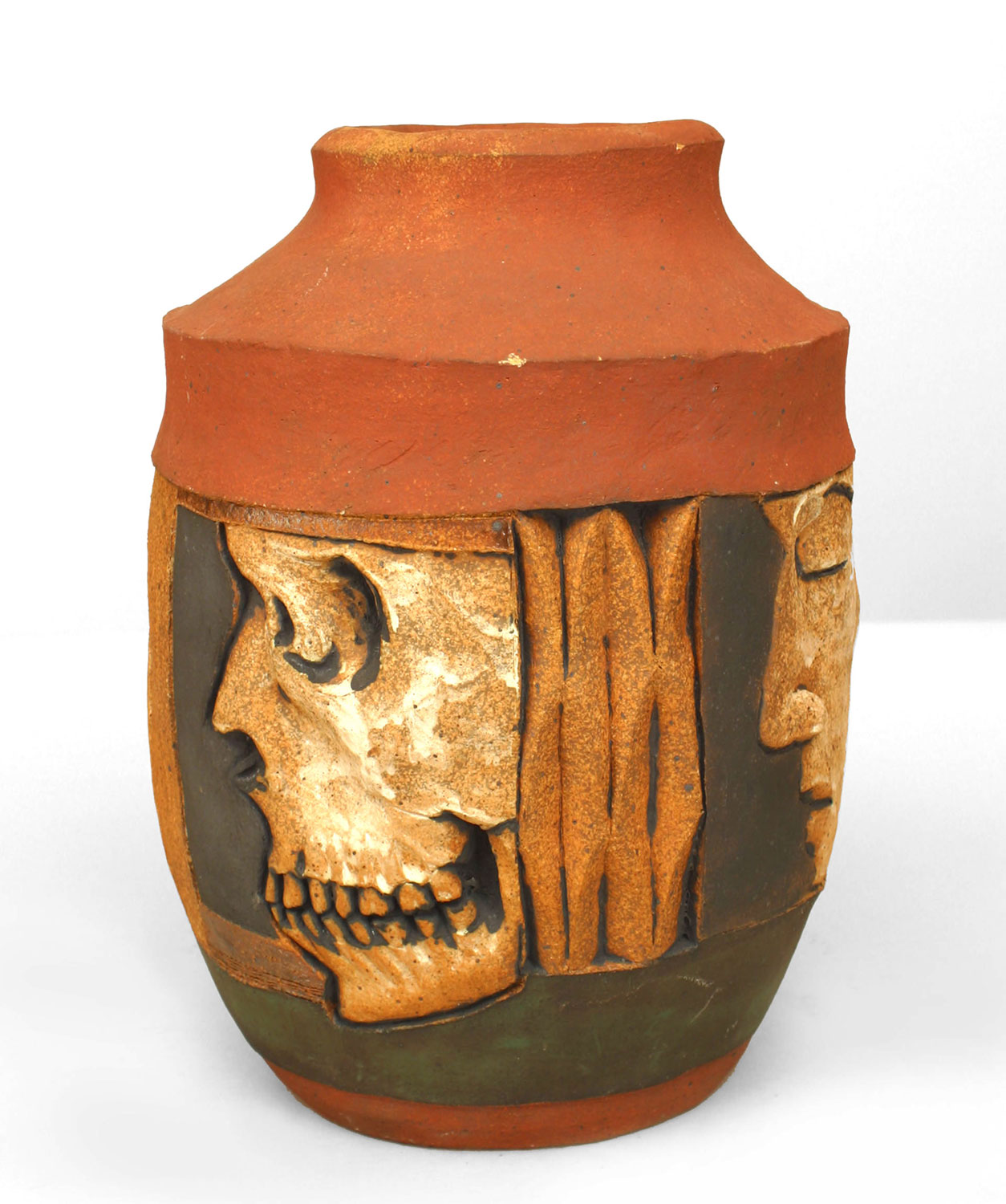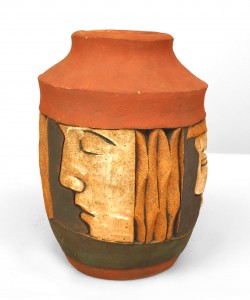 American Post-War Design terra cotta and black trimmed vase with 4 profiles of faces in relief. (by ROBERT BENTLEY).