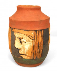 American Post-War Design terra cotta and black trimmed vase with 4 profiles of faces in relief. (by ROBERT BENTLEY)