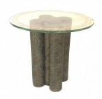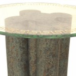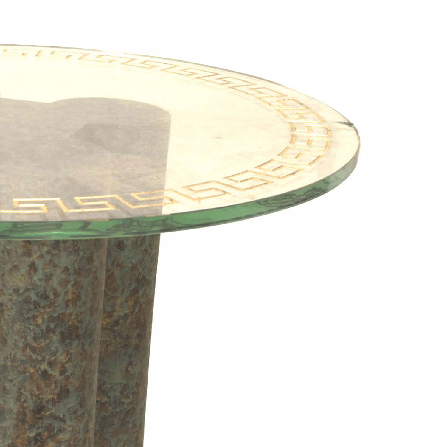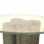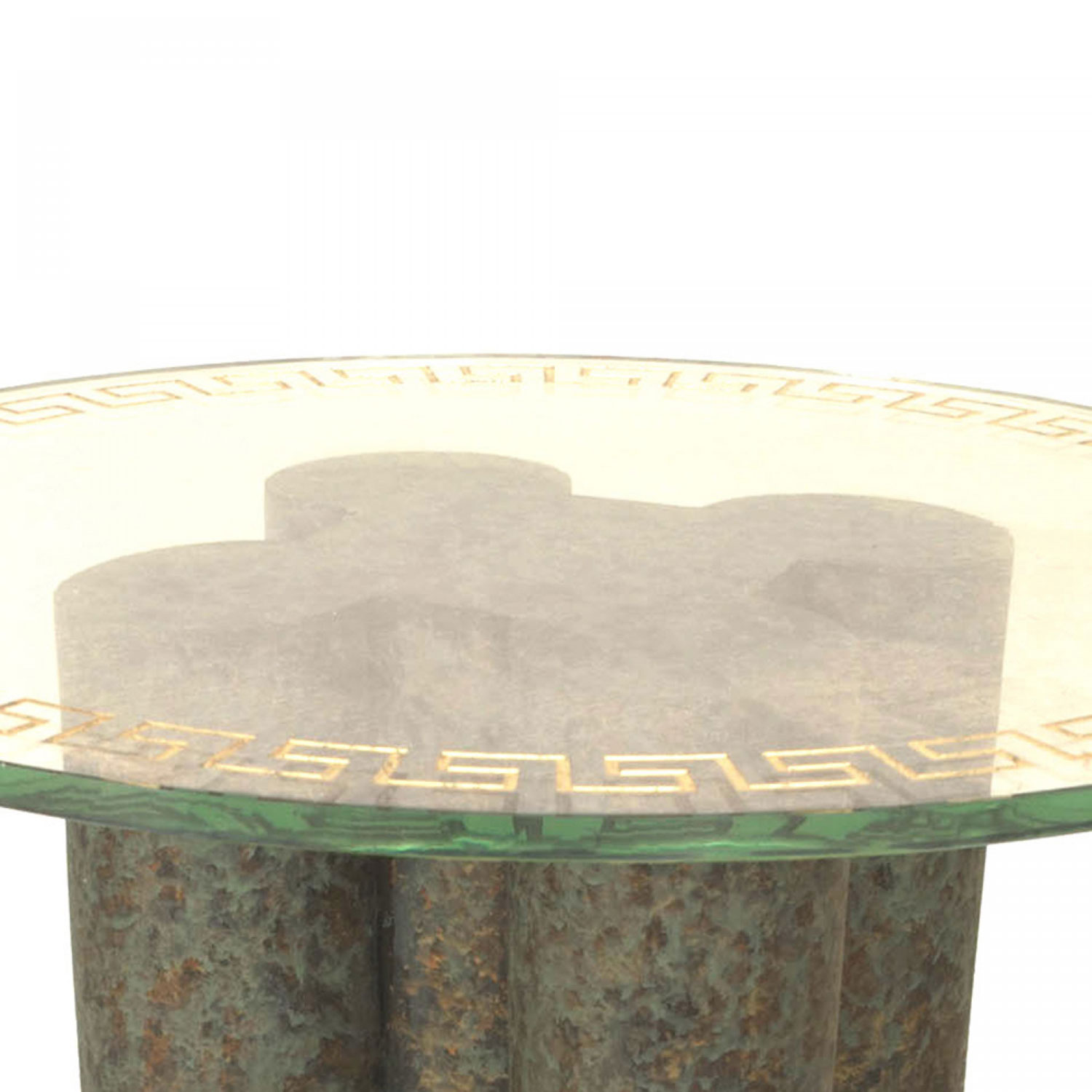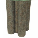American Post-War Design low end table with a verdigris green marbleized terra cotta clover leaf shaped base supporting a round glass top secured with a brass center..