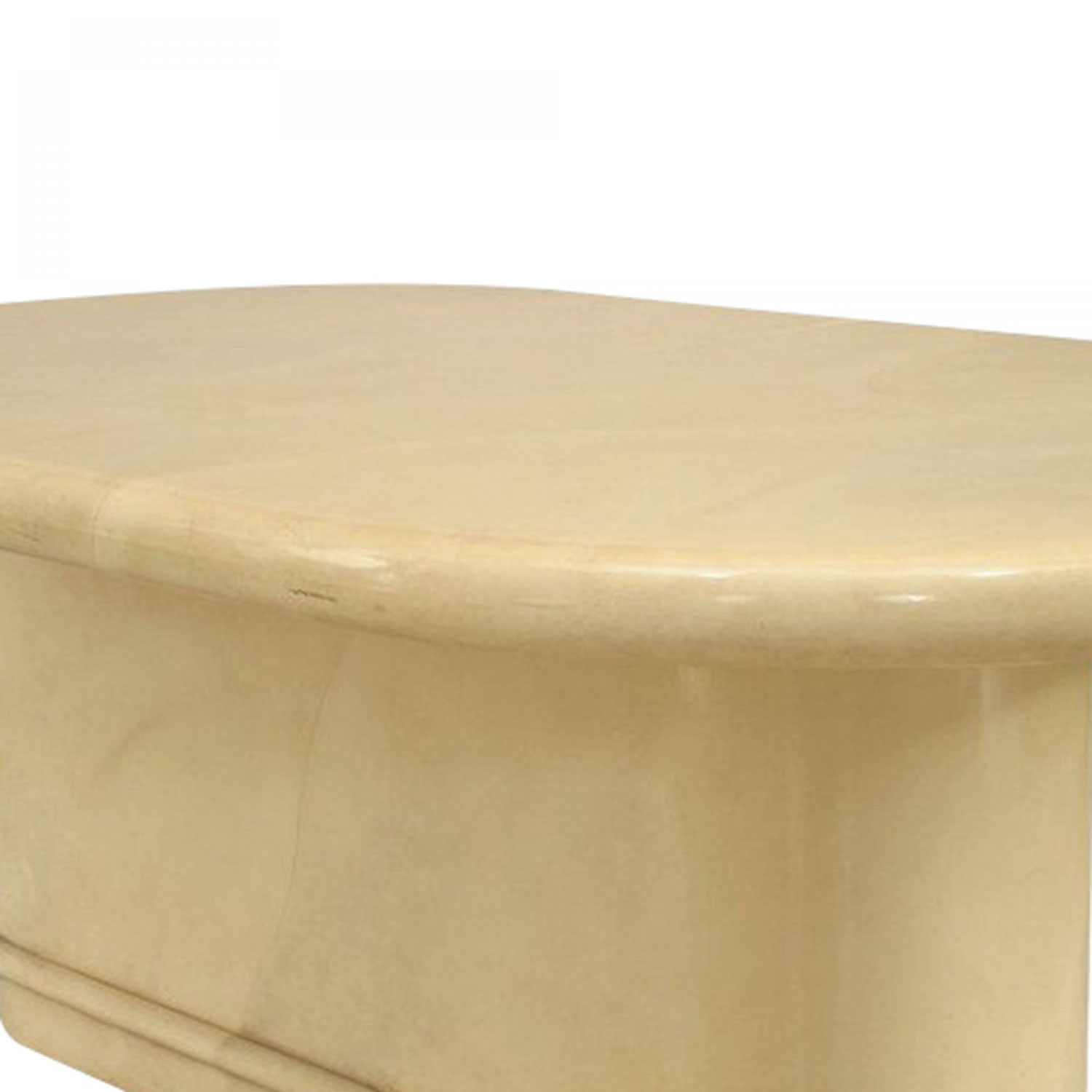 Style: Contemporary/Post-War Design Materials & Techniques: Arch, veneer Category: Tables, Office/Library, Dining Room Condition: Parchment veneer suffers from significant cracking along the rim of the table top. Inquire for more information.