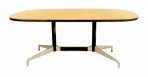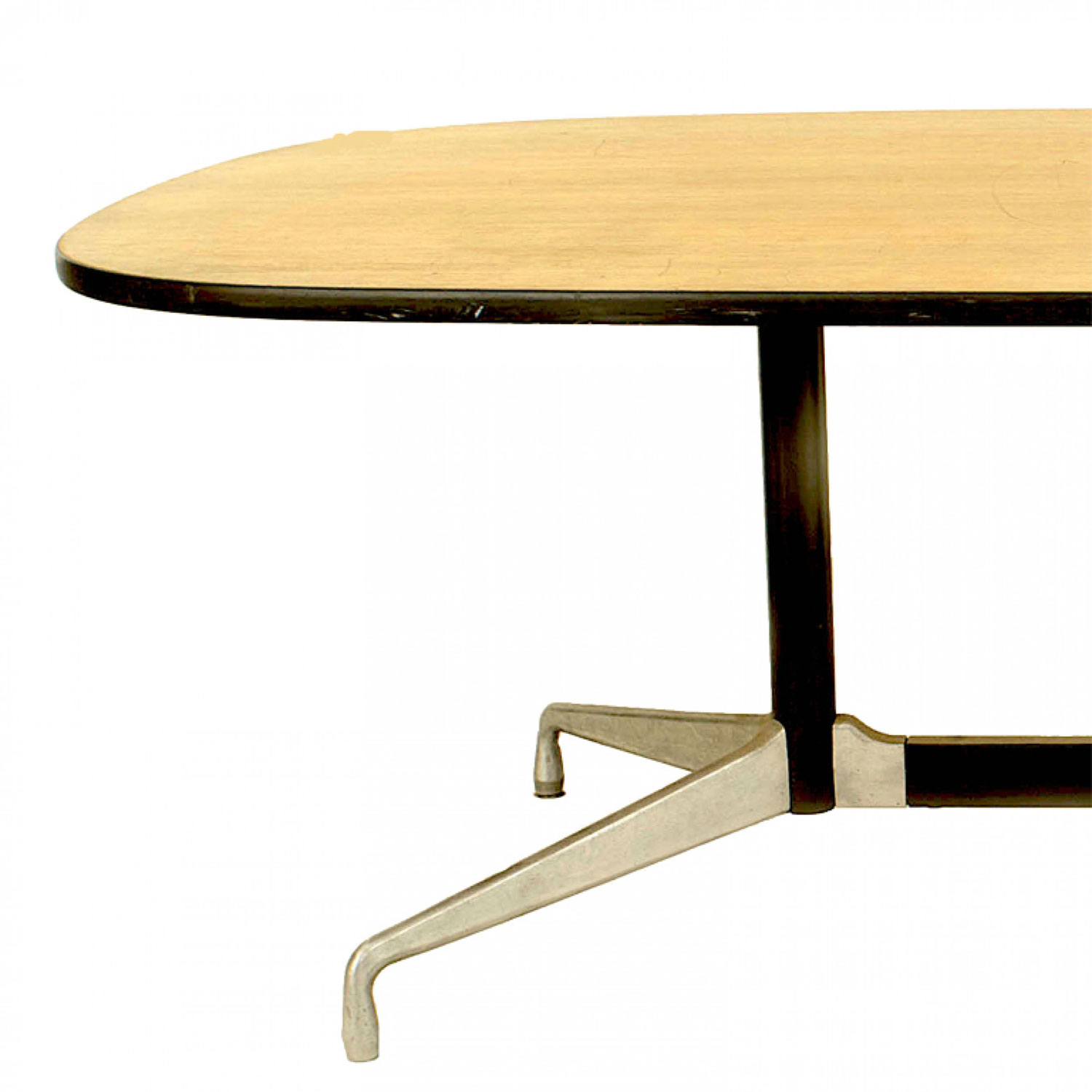 American Post-War Design oval conference table with wood veneer top resting on an ebonized trimmed and aluminum double pedestal base (design by EAMES for HERMAN MILLER).