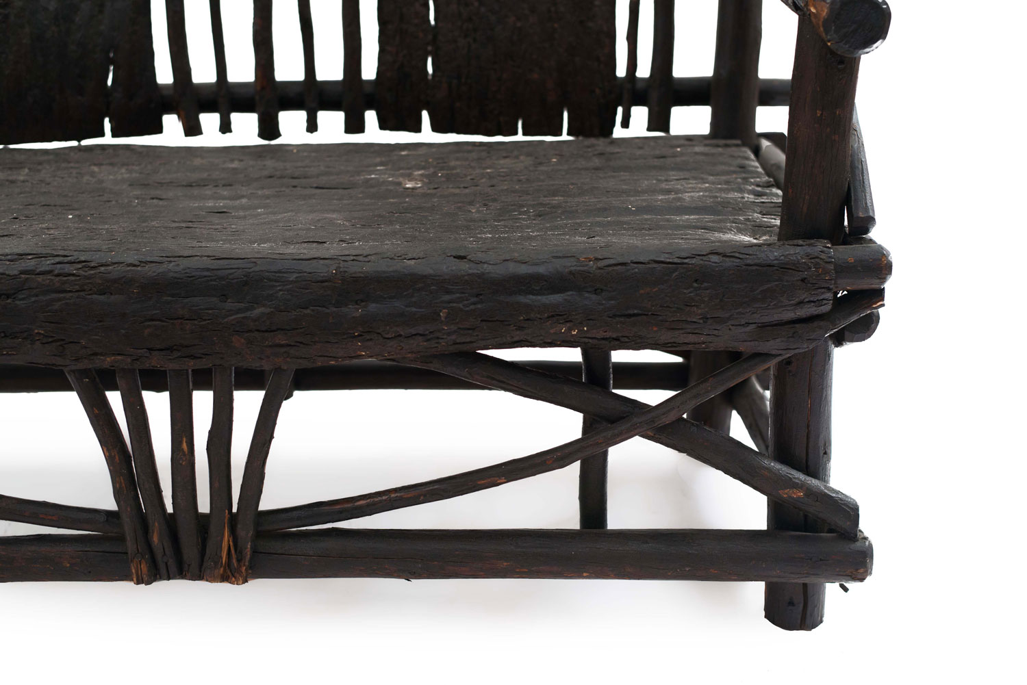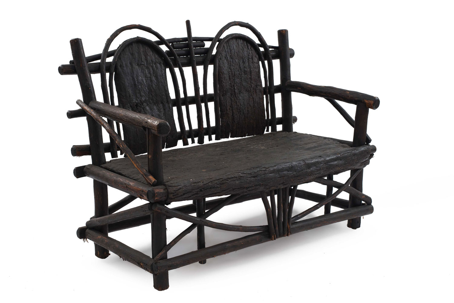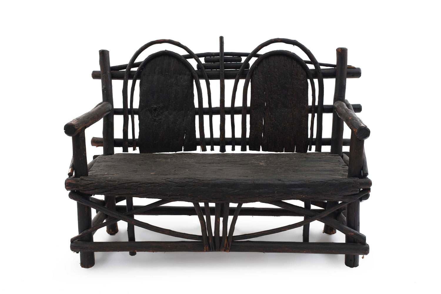 American Rustic Adirondack loveseat of bent willow, twig & root construction with double arched barked splat back & seat (19th Cent).