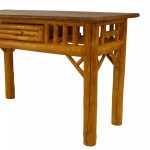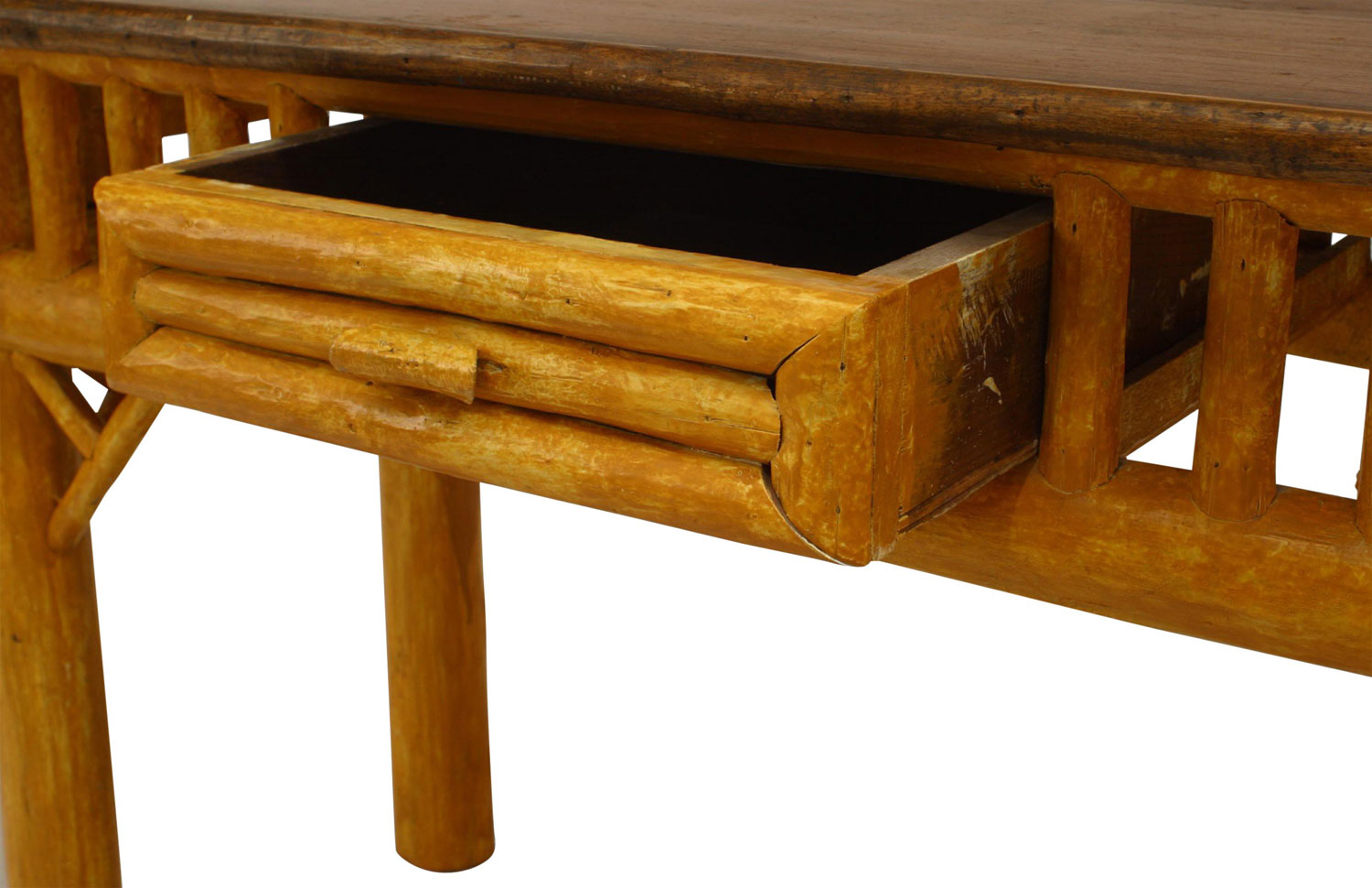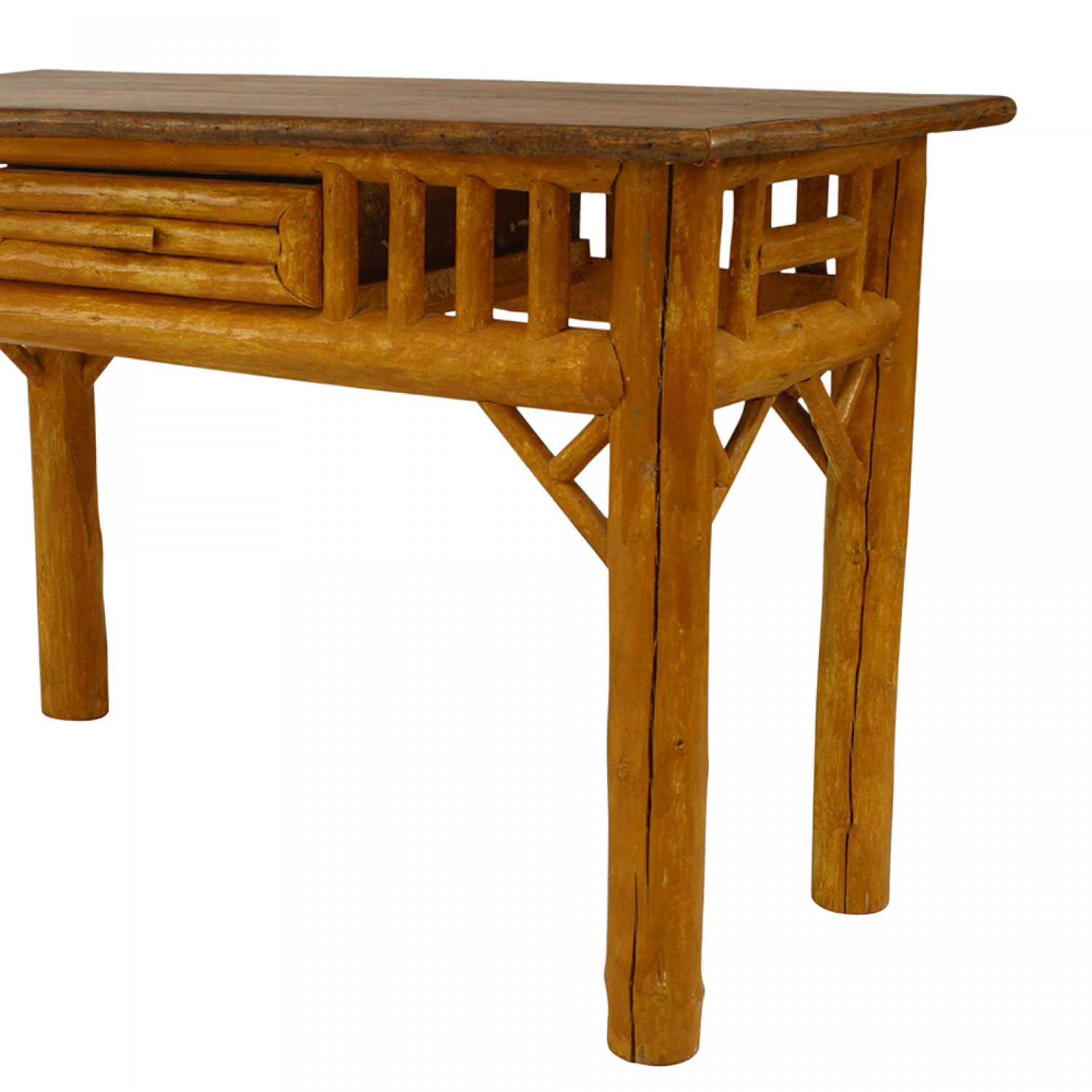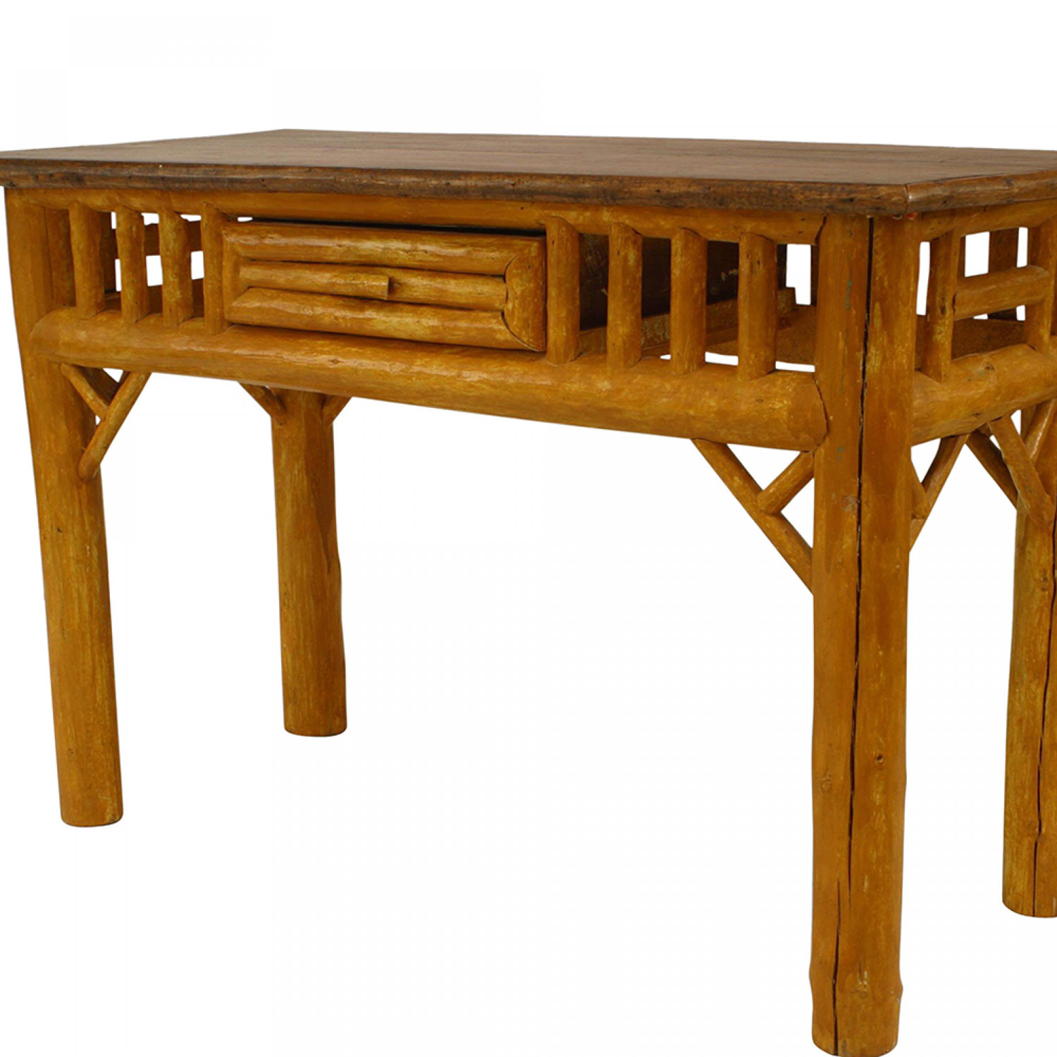 American Rustic Adirondack painted cedar table desk with twig spindle design and stained pine slat top with a center drawer..