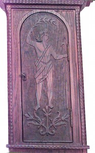 American Rustic Adirondack Tramp Art (19th Century) grandfather clock with arched pediment over relief carved figures & scrolling designs (Not working)