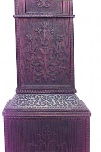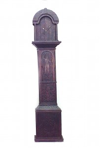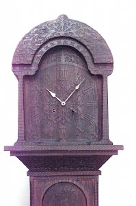 American Rustic Adirondack Tramp Art (19th Century) grandfather clock with arched pediment over relief carved figures & scrolling designs (Not working).