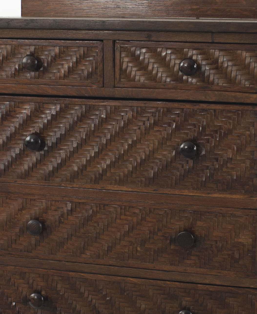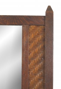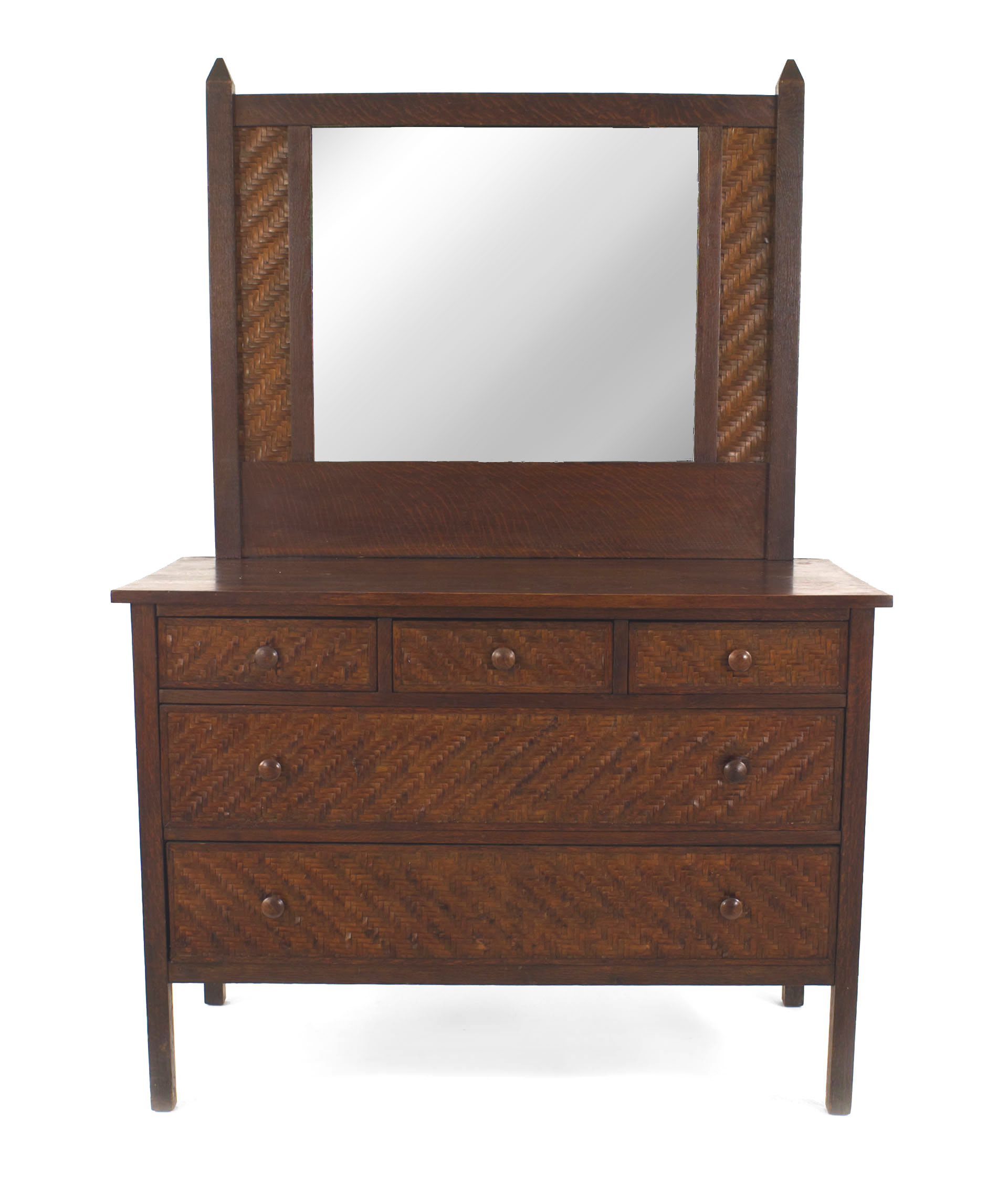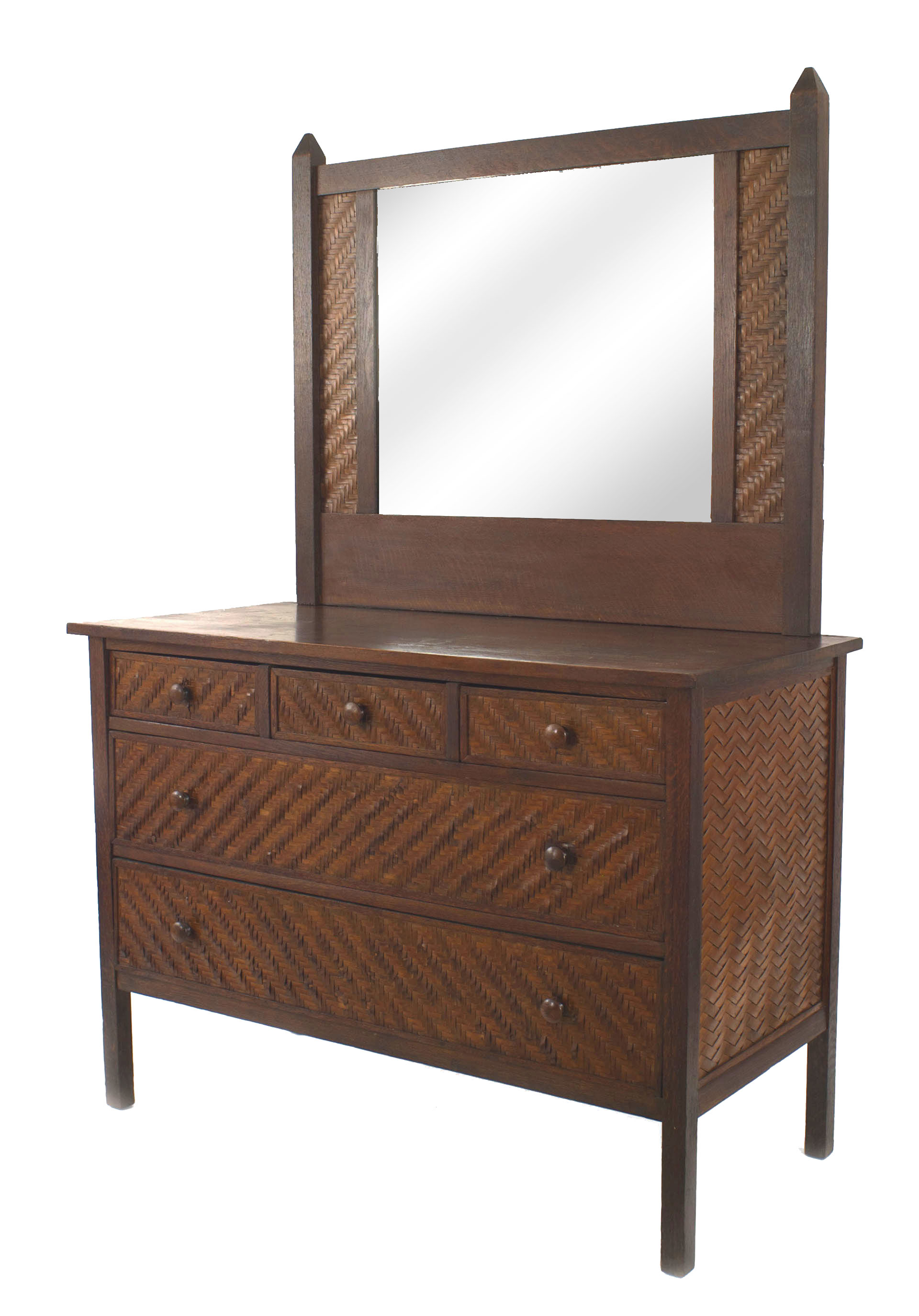 American Rustic Mission (2nd quarter 20th Century) dark stained oak dresser with mirror having 3 drawers over 2 large drawers with splint wood woven sides & trim (Indian Splint Manufacturing Co) (Related items: 061006, 061007)