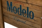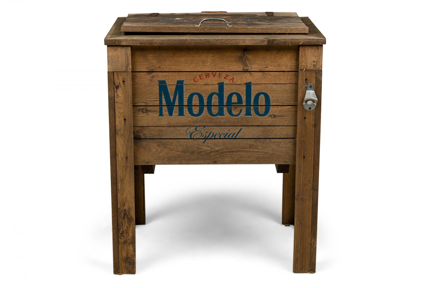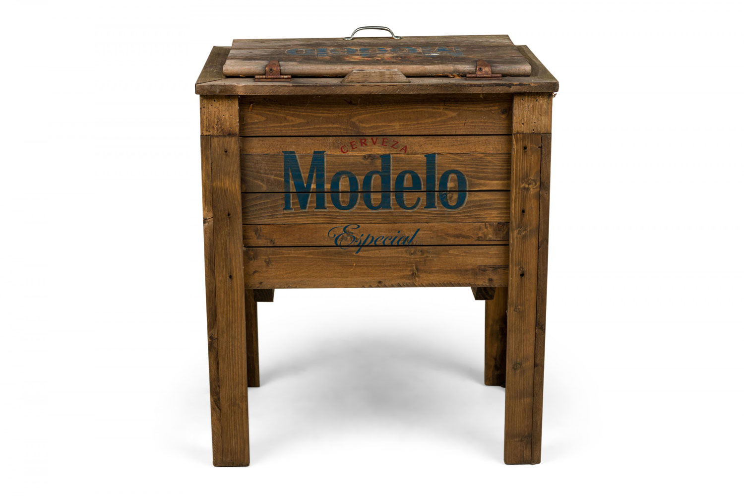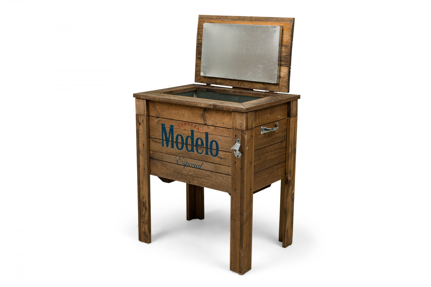 American rustic wooden cooler chest with metal interior. (branded, MODELO).