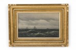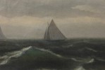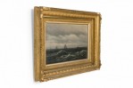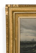 American 19th Century oil painting on canvas depicting ships at sea with rough water and gray skies in a gilt frame.