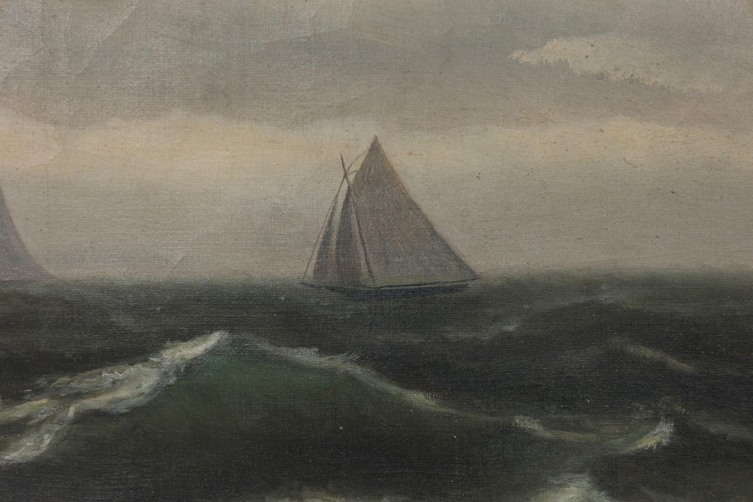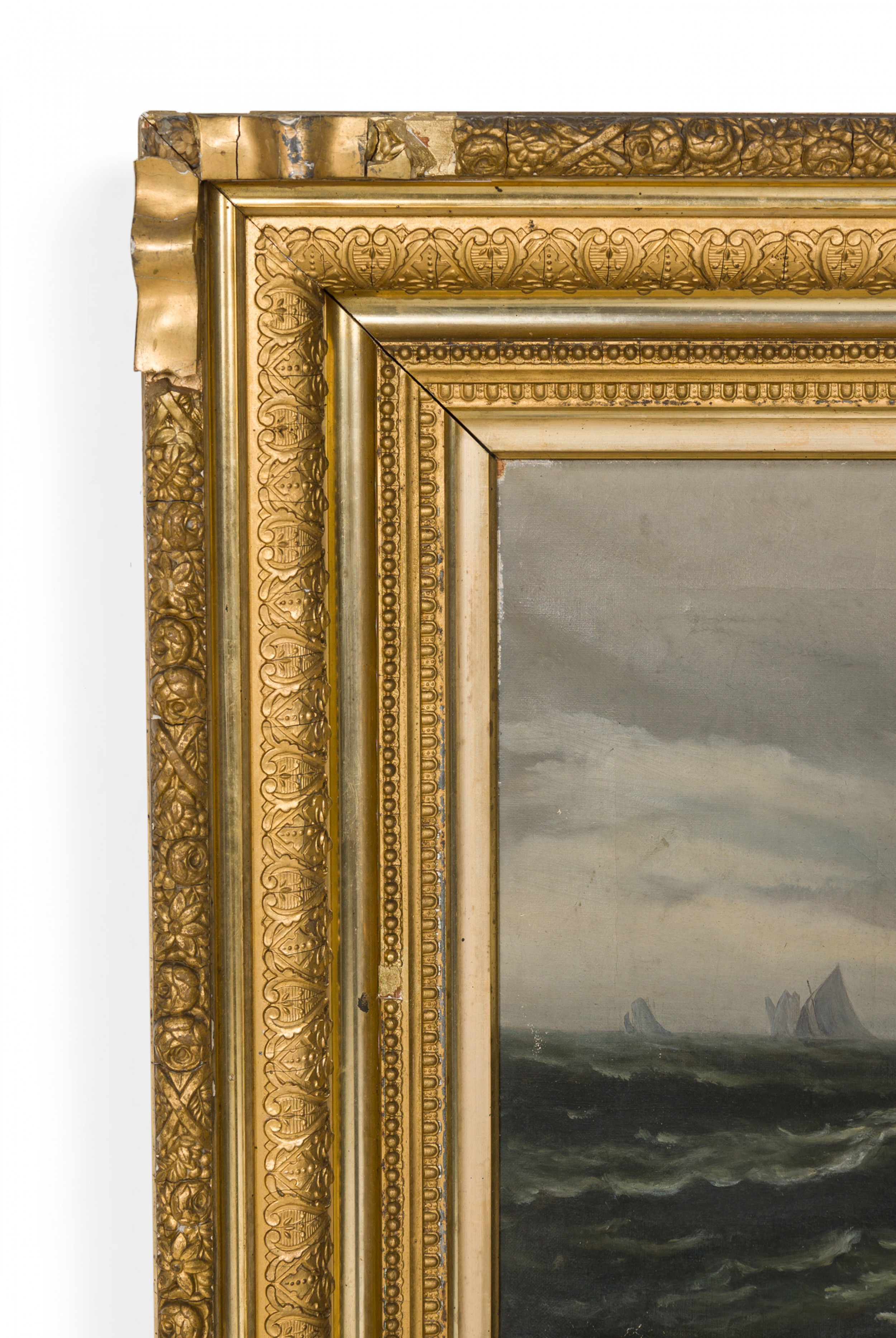 American 19th Century oil painting on canvas depicting ships at sea with rough water and gray skies in a gilt frame..