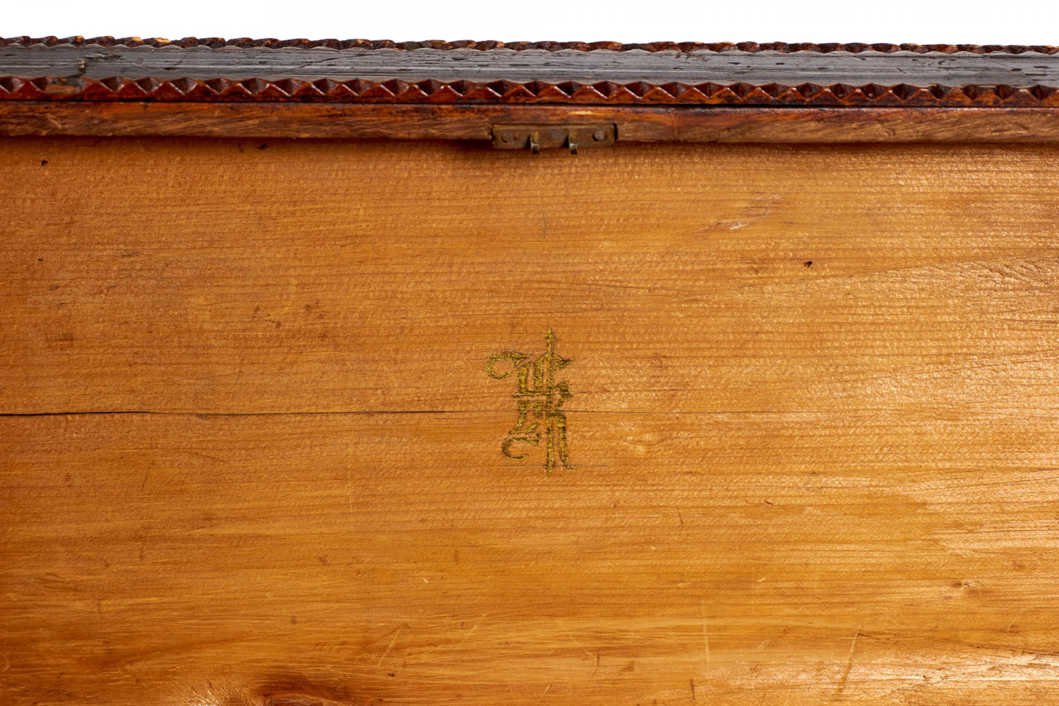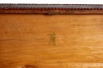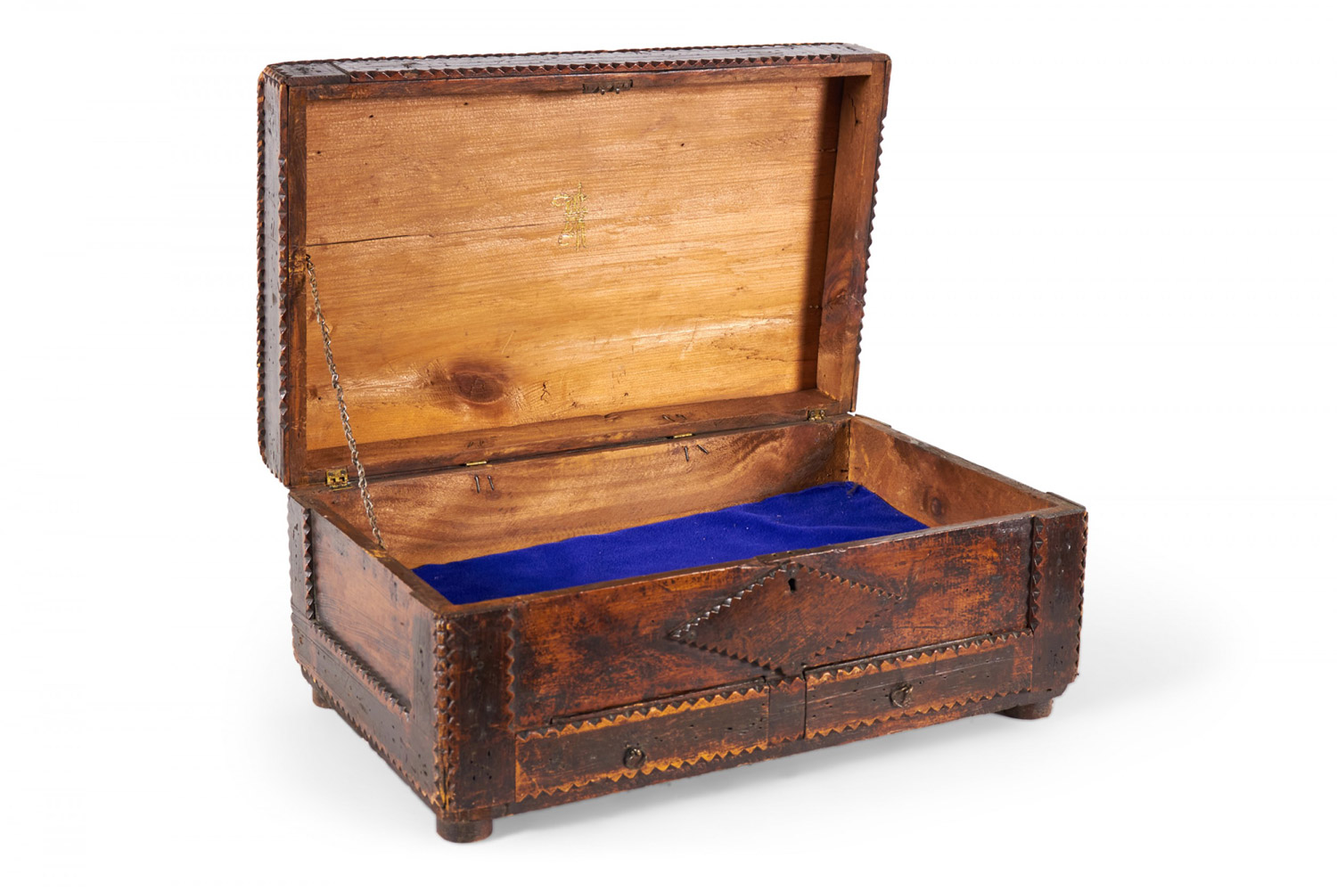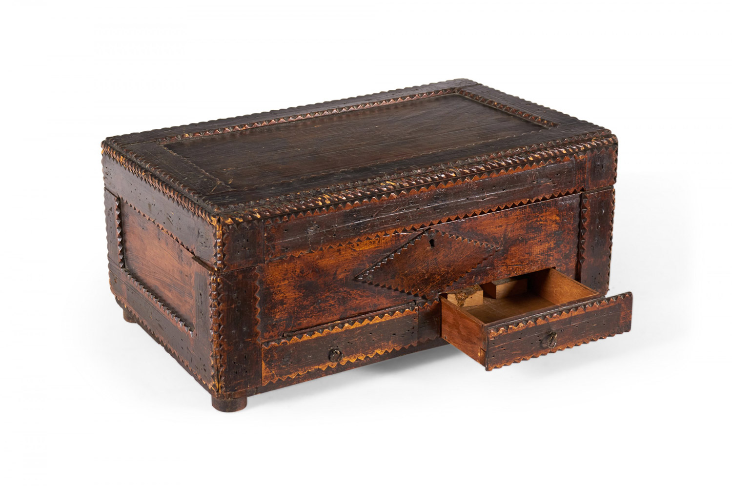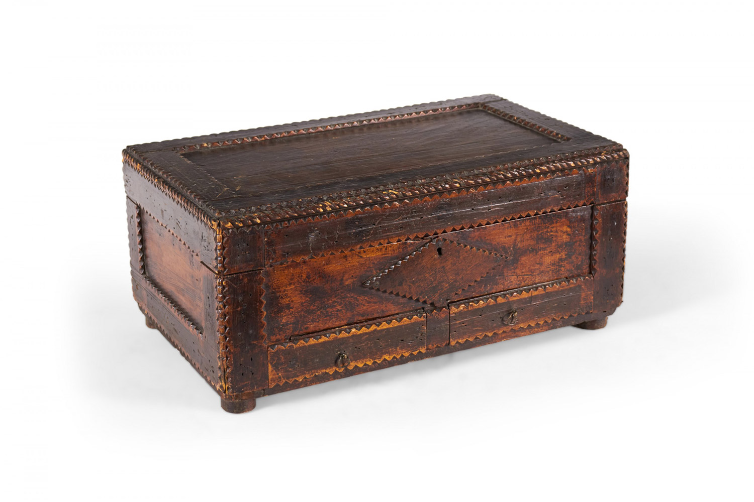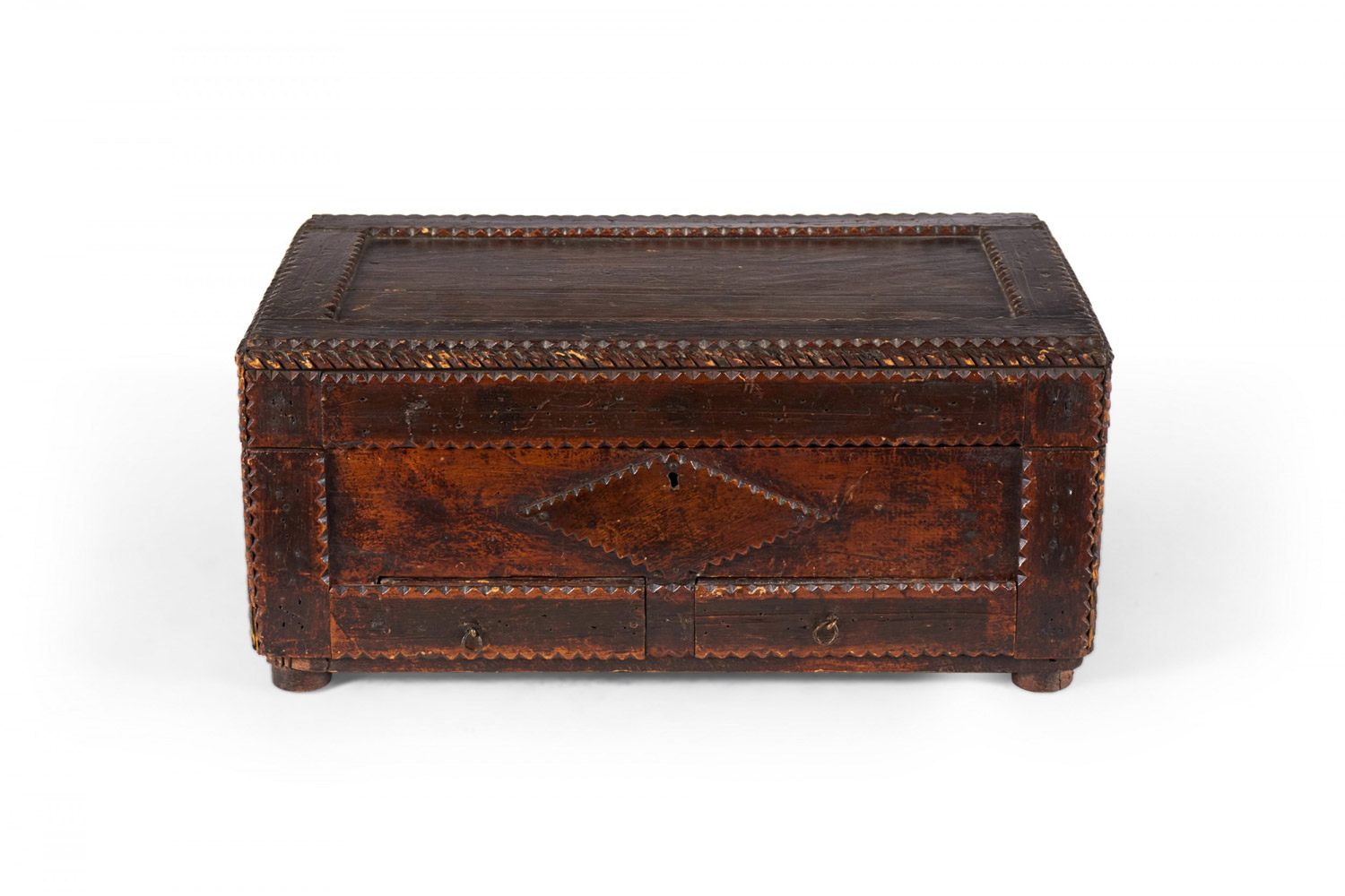 American Country-style (19/20th Century) Tramp Art large rectangular shaped wood box with two bottom drawers and scalloped design