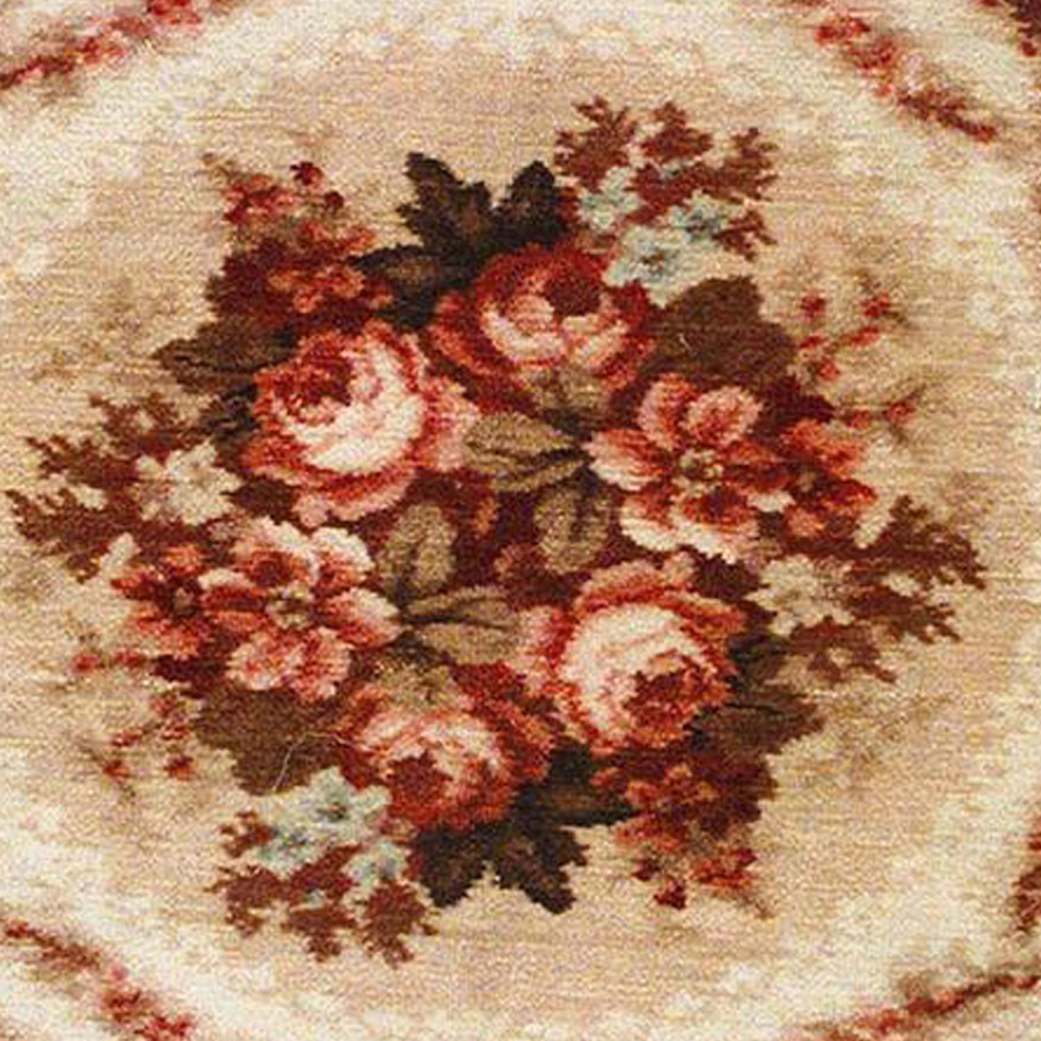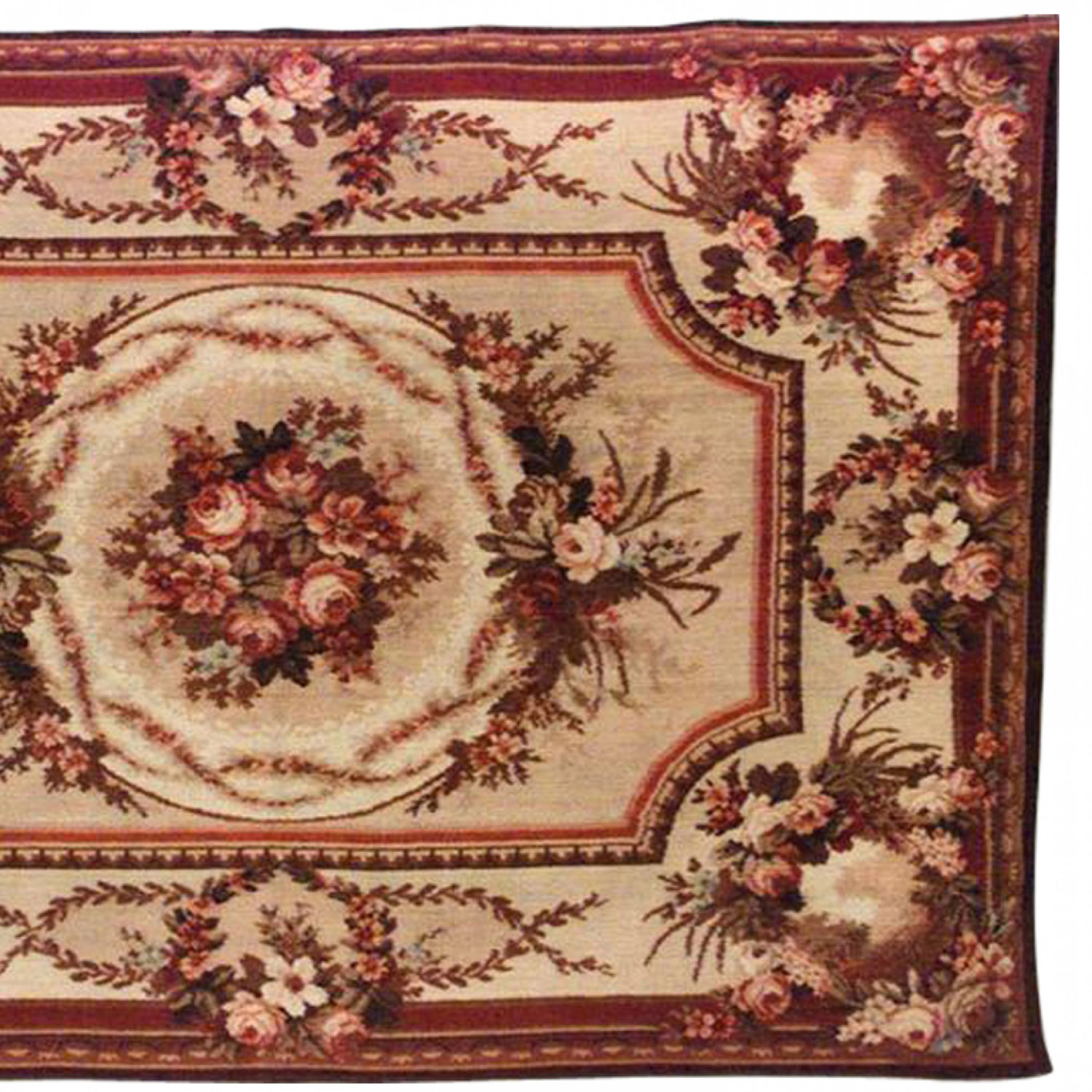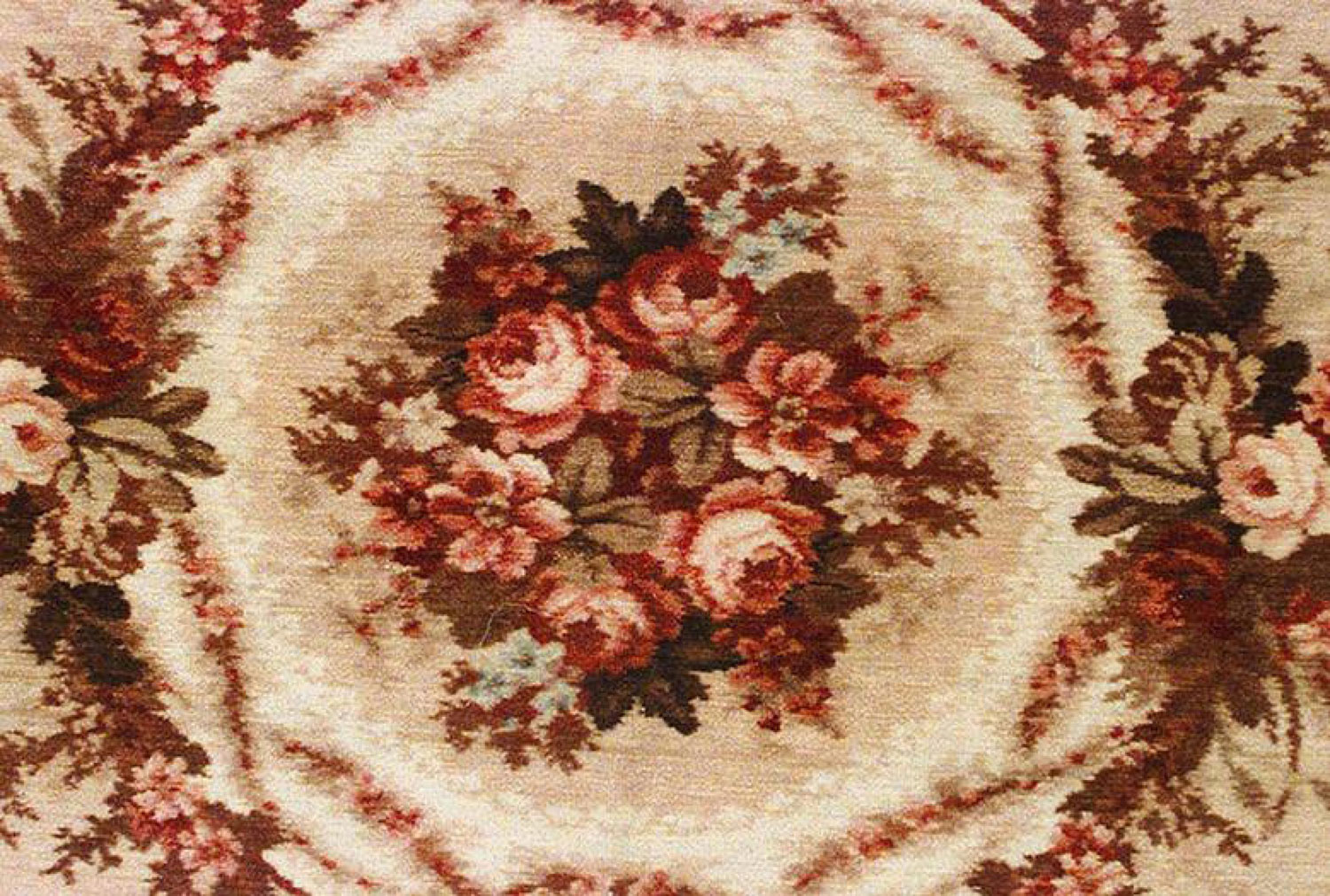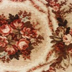American Victorian beige and maroon velvet table cover with floral/roses design and wreath border.