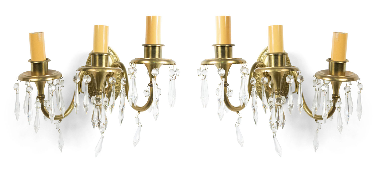 5 American Victorian-style (20th Century) bronze wall sconces with three scrolling arms hung with crystal drops and oval backs. (signed: STERLING BRONZE CO. NEW YORK) (PRICED EACH).
