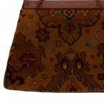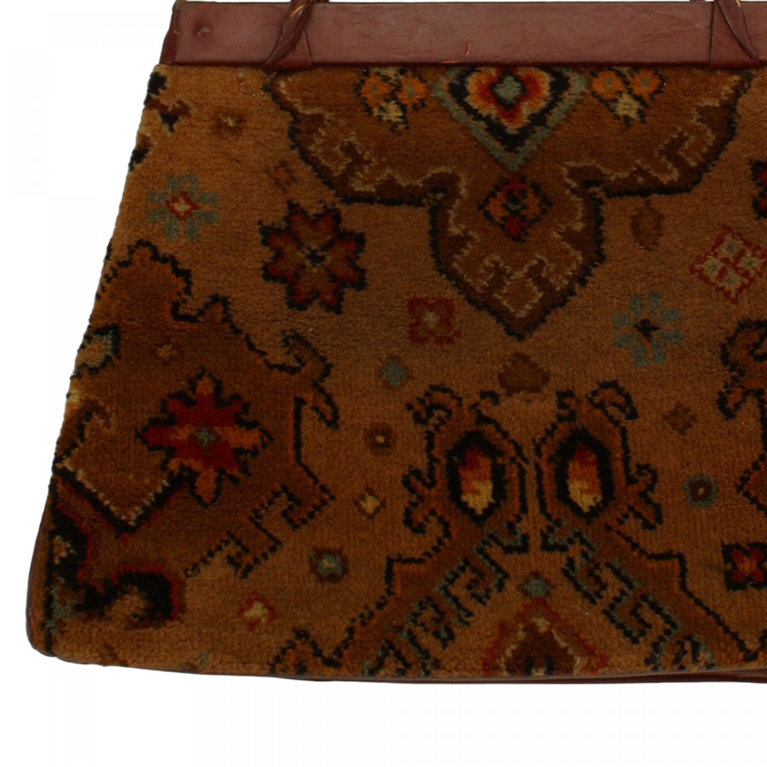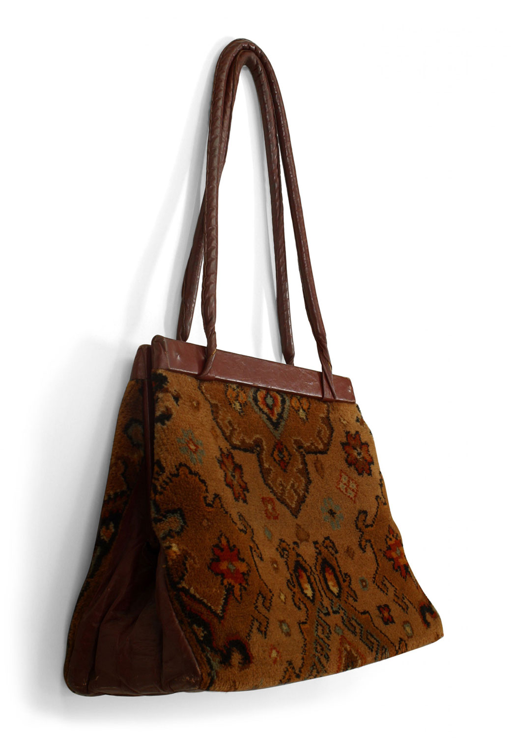American Victorian carpet bag with red leather trim and shoulder handles.