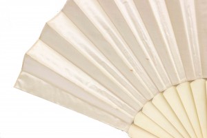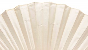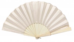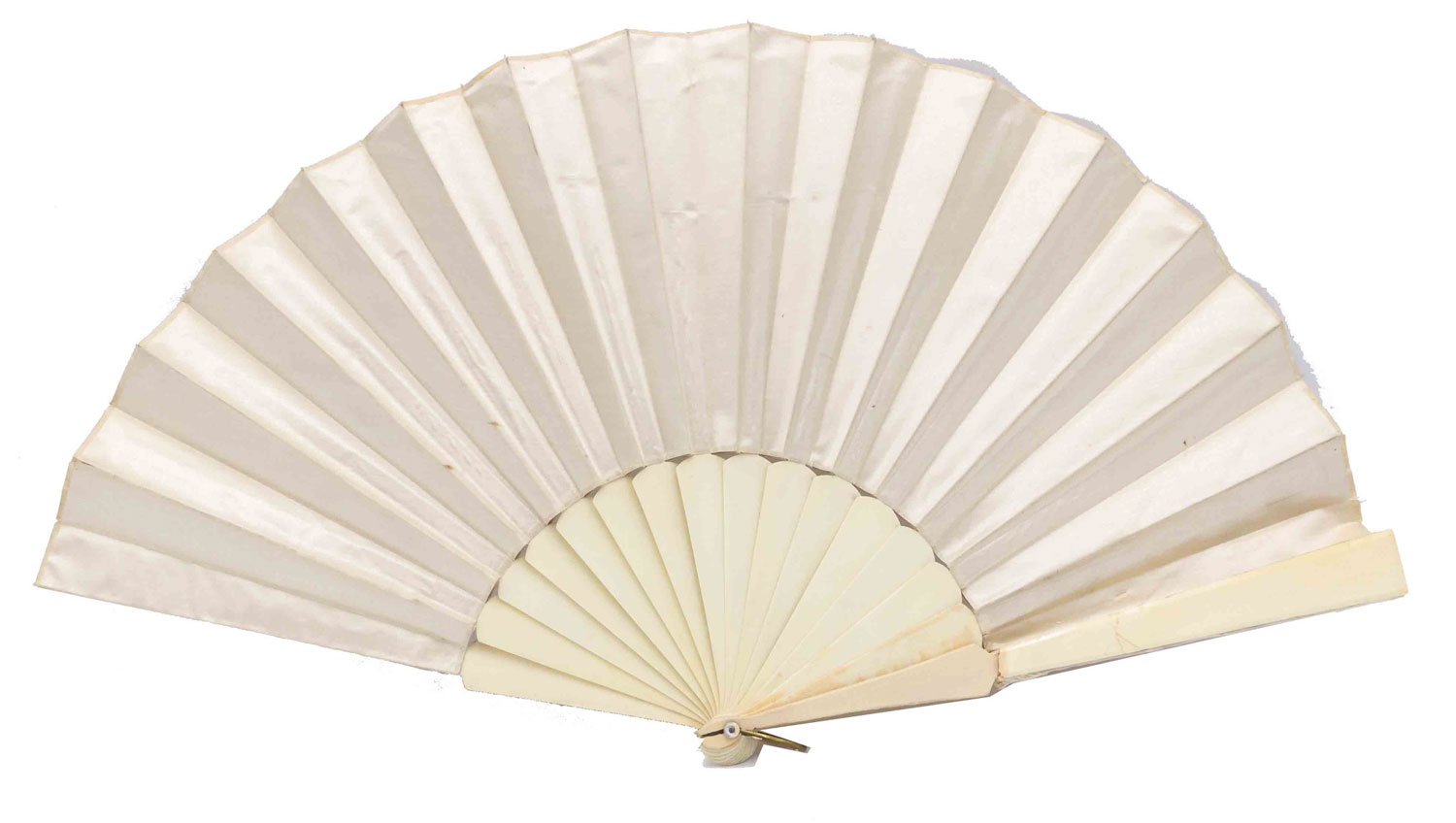 Style: American Materials & Techniques: Silk, wood Category: Accessories/Décor/Bric-a-Brac Condition: The right fan guard has loss and cracks to its white lacquer finish. Light fraying of silk.