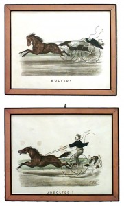 SET of 6 American Victorian maple framed 19th Century colored lithographs of figures and horses (signed THOS. WORTH).