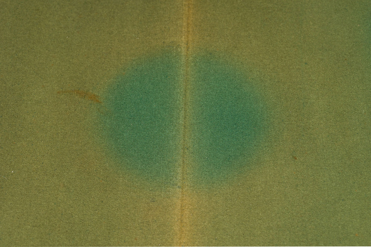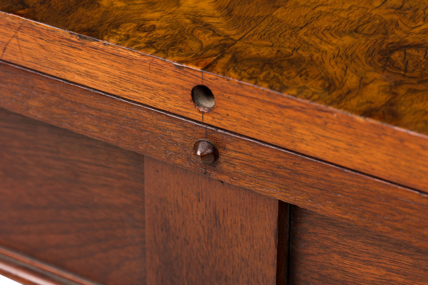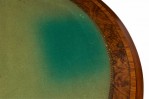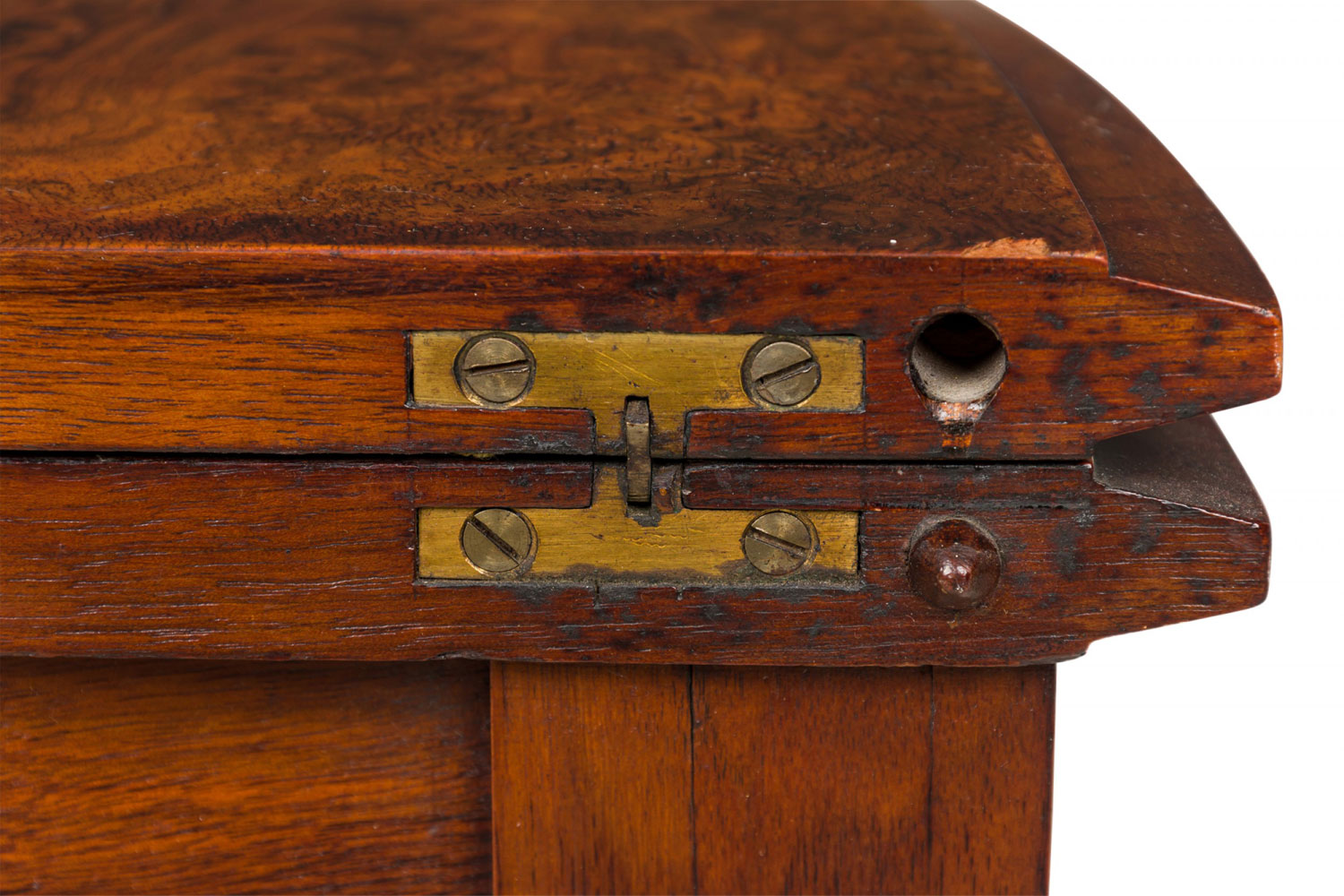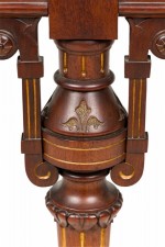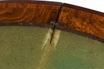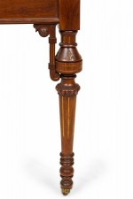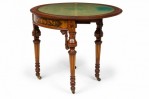 Style: American Materials & Techniques: Inlaid, leather, turned, wood Category: Tables Condition: Wear to finish, fading and discoloration to leather surface. Depth with top extended: 30". Good; Wear consistent with age and use