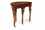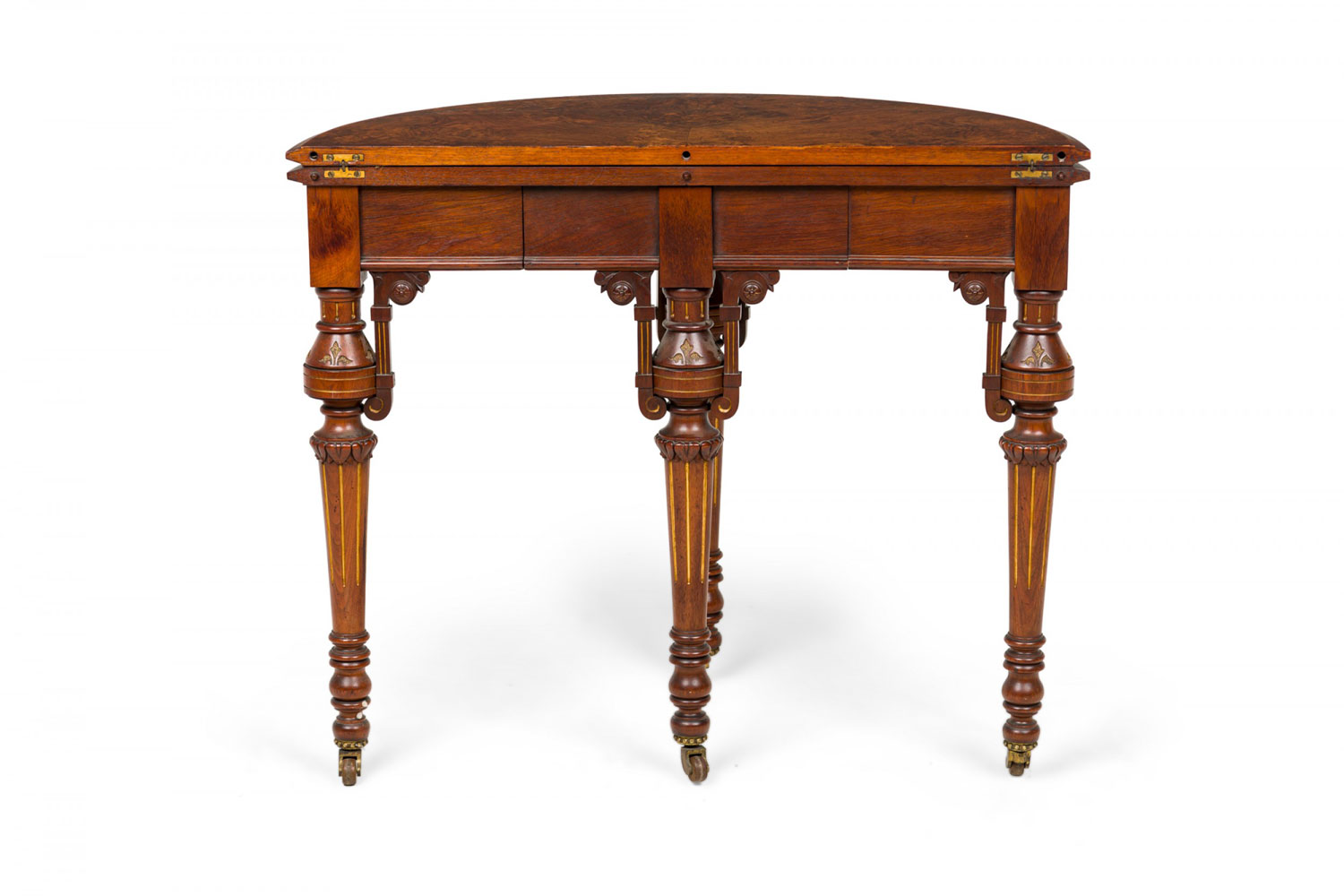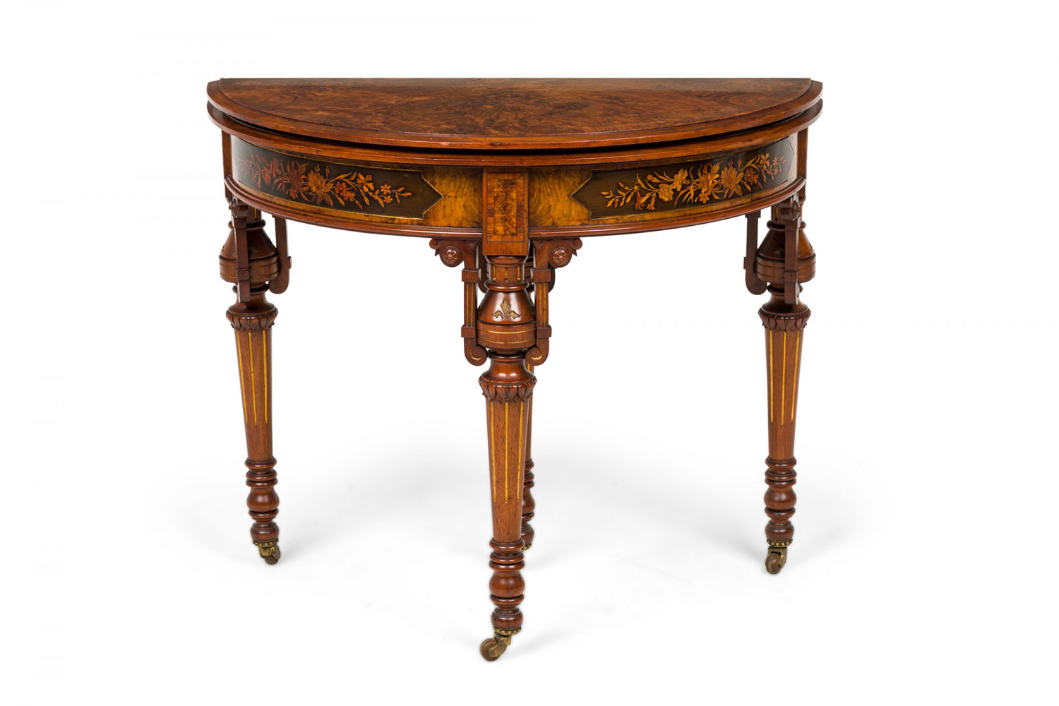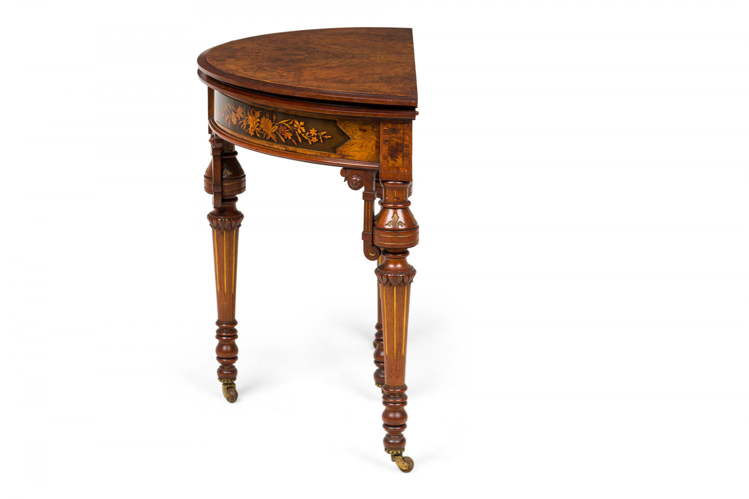 American Victorian Folding Wood Demilune Console Table with Extendable Top and Floral Inlay