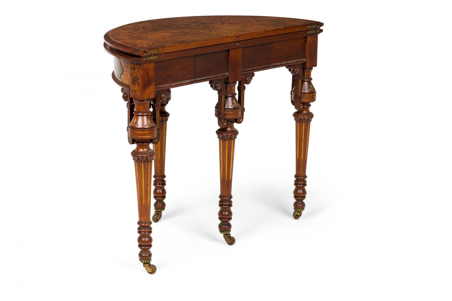 American Victorian demilune wooden console table with floral inlaid apron with gold detailing and a burl wood hinged top that unfolds with an extendable back leg to create a circular surface finished with green embossed leather, resting on 4 turned and fluted legs on casters..